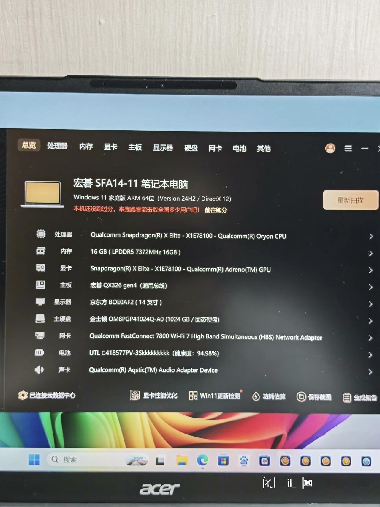 骁龙Xe(骁龙X系列)笔记本性能定位轻薄本天花板、长续航王者,但游戏能力有限,: 🖥️ CPU性能(相当于台式机哪款?) - 骁龙X Elite(顶配) 单核 ≈ i5‑13500 / i7‑12700K 多核 ≈ i5‑13400 / R5 7600 但运行x86软件会降速约20–30% - 骁龙X Plus(中配) 单核 ≈ i5‑12400 多核 ≈ i3‑13100 / R5 5600 一句话:日常办公、网页、视频、轻度生产力很强;重度渲染、编译、大型软件不如同价位x86台式机。 🎮 核显性能(相当于哪款独显?) Adreno X1核显: - 顶配 Elite:4.6 TFLOPS ≈ MX350 / GT1030 ~ GTX1650 之间 - 中配 Plus:3.8 TFLOPS ≈ MX330 / GT1030 一句话:接近入门独显,远不如RTX 3050/4050。 🎯 游戏表现(能不能玩?) - LOL、CS2、原神低画质:1080p 60fps 没问题 - 控制、博德之门3:1080p 低画质 30–50fps - 3A大作、光追游戏:基本不推荐,卡顿明显 一句话:轻度网游OK,3A别指望。 ✅ 适合人群 - 办公、出差、长续航(10–20小时) - 视频剪辑、AI应用(NPU很强) - 不玩大型游戏的用户 ❌ 不适合 - 重度游戏党 - 专业渲染、建模、编译