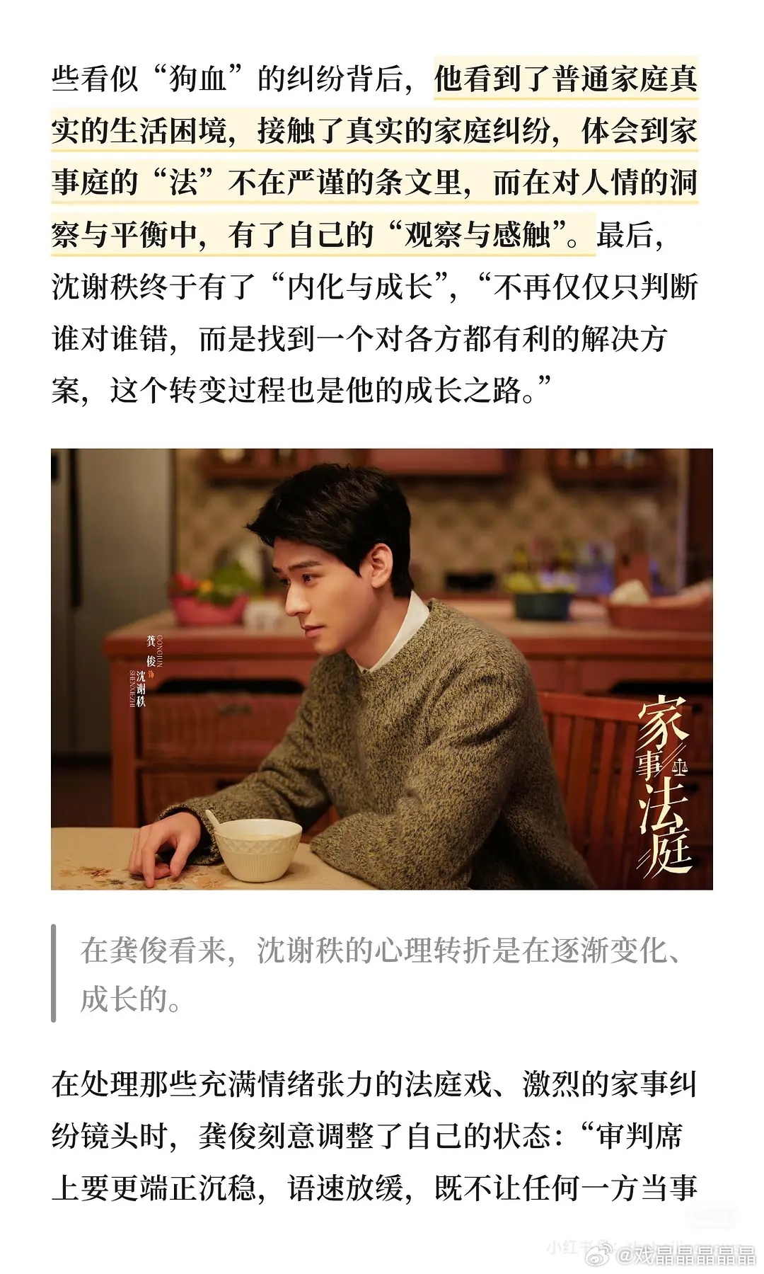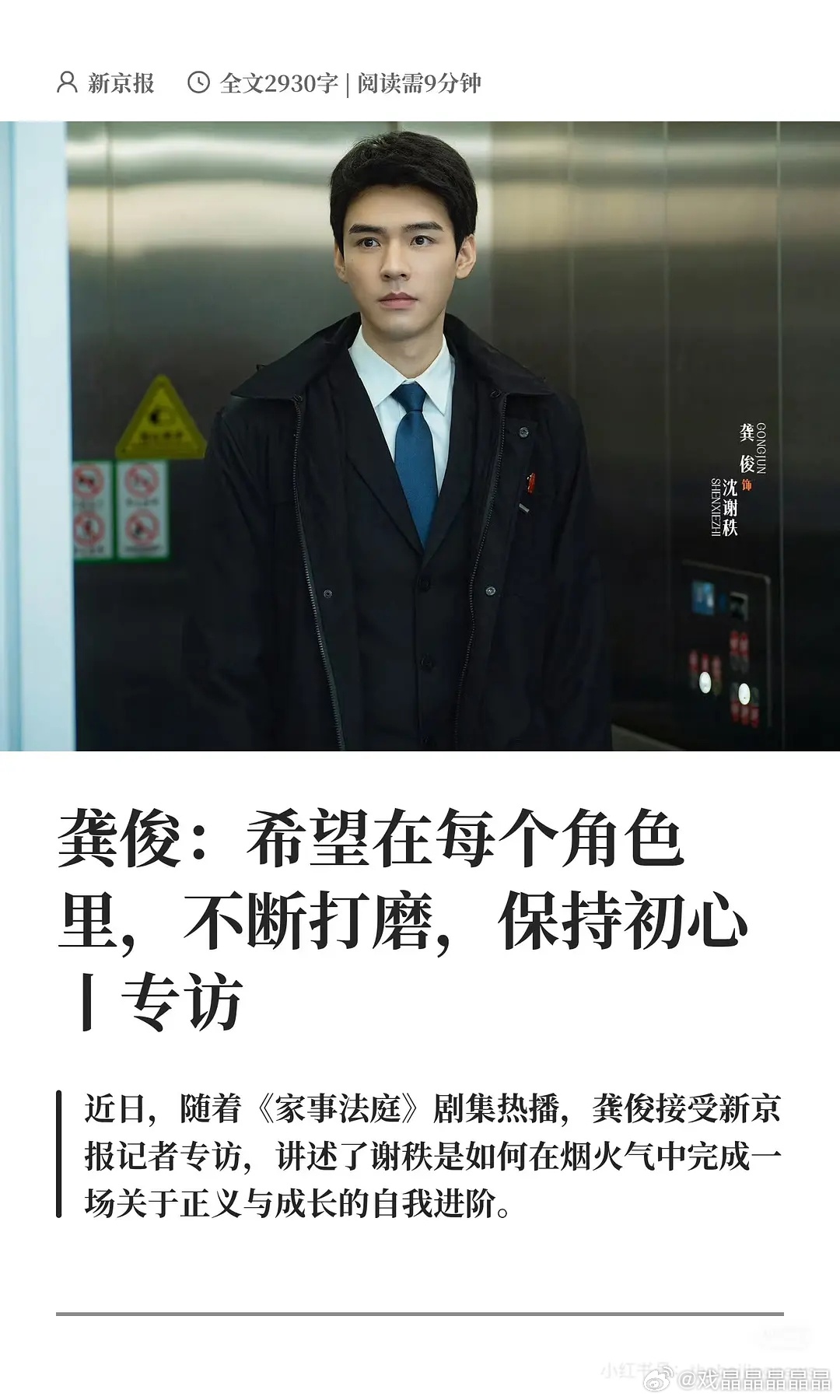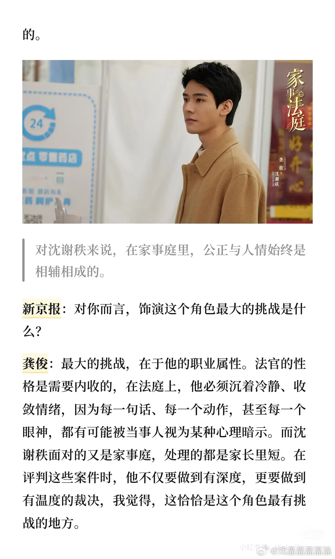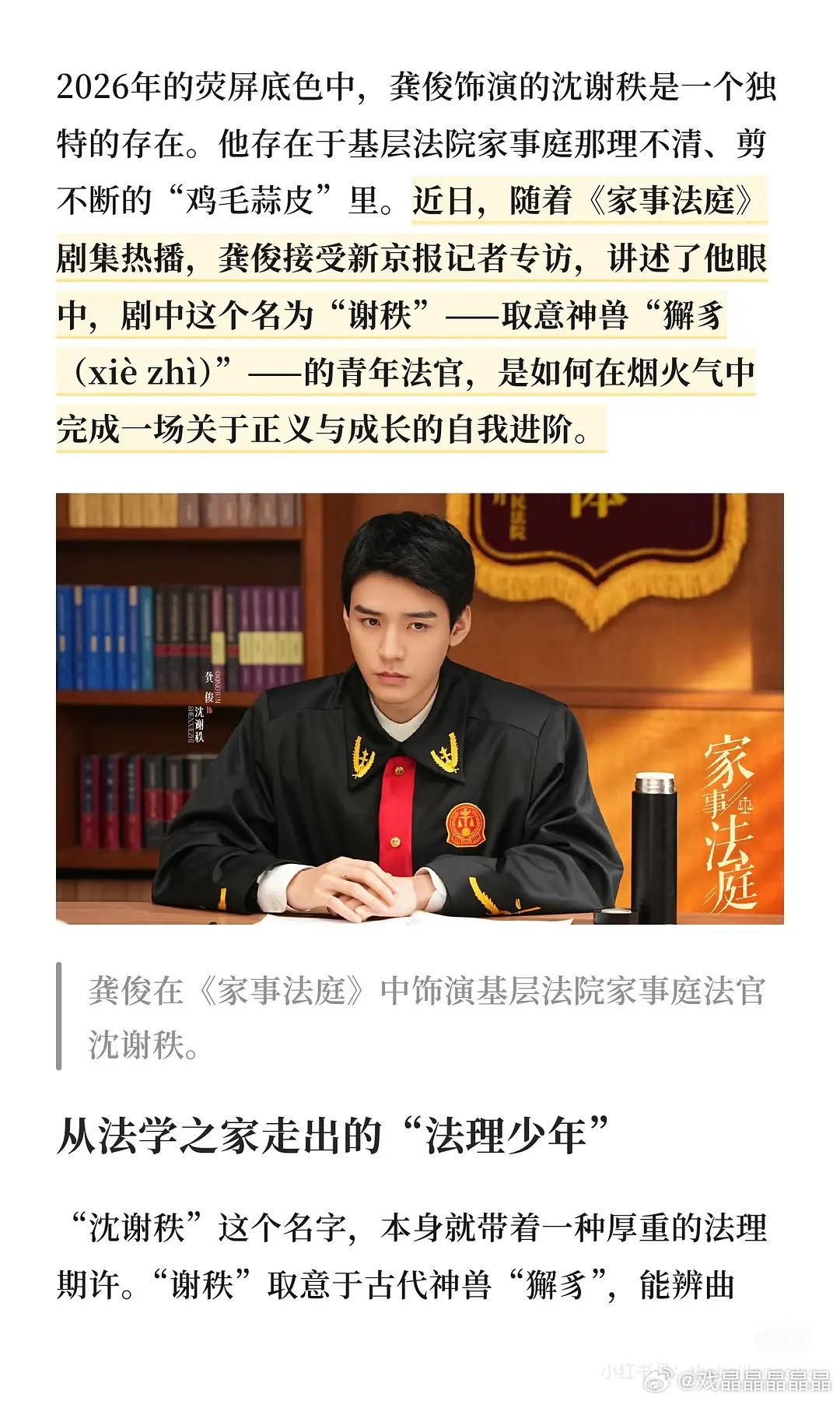 龚俊接受新京报采访,谈《家事法庭》中,剧中这个名为"谢秩"-﹣取意神兽"獬豸( xie zhi )"-﹣的青年法官,是如何在烟火气中完成一场关于正义与成长的自我进阶。