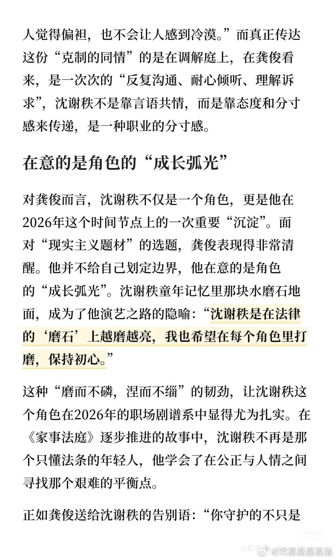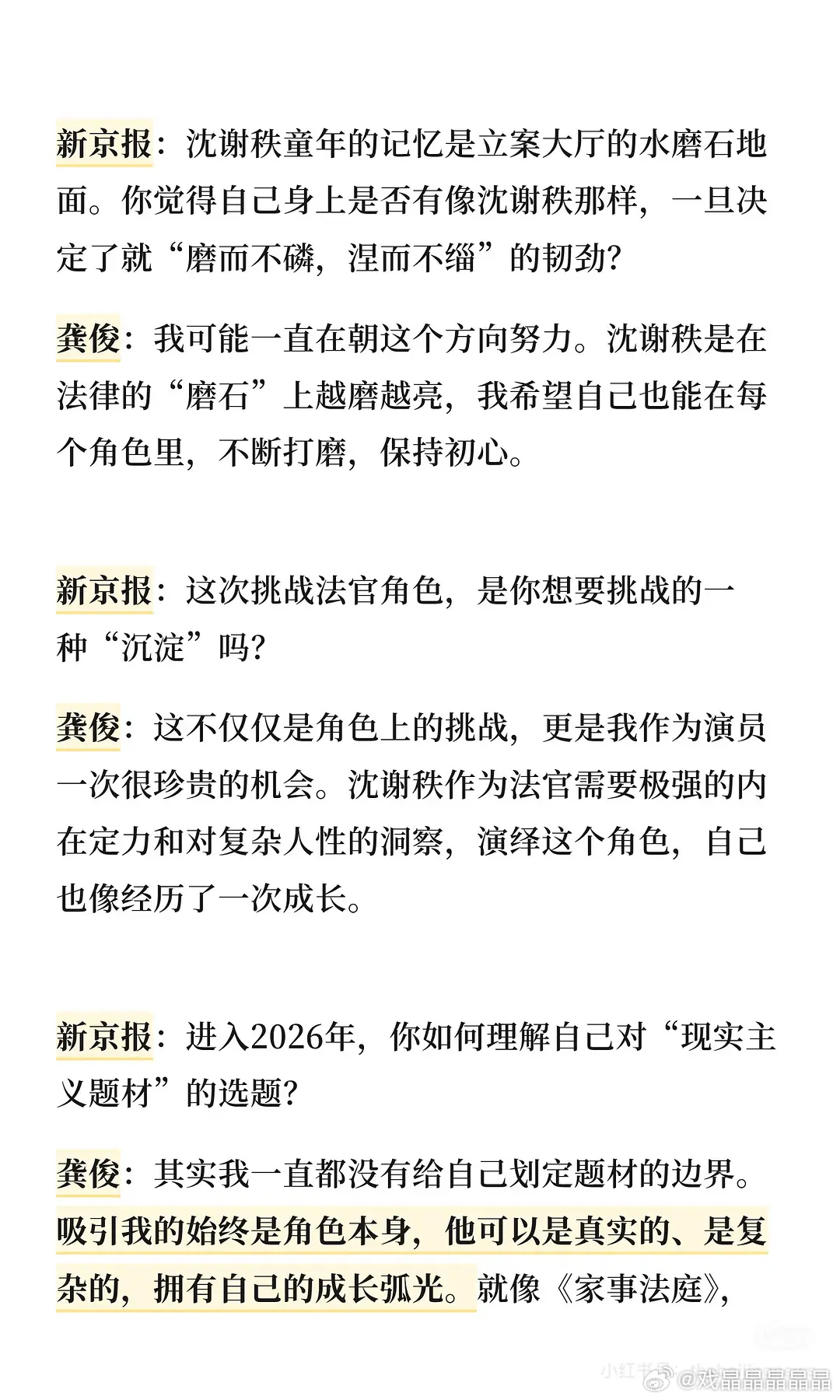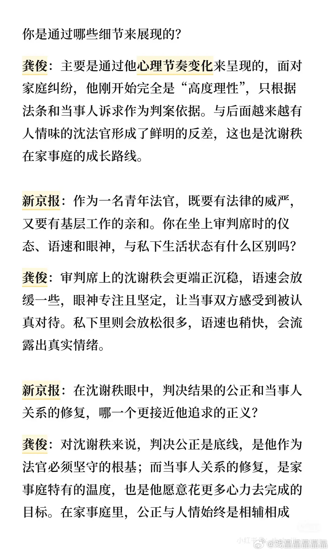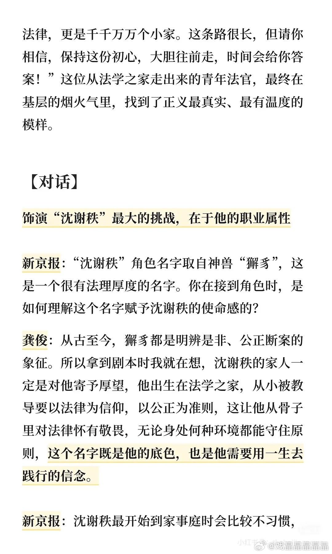 龚俊接受新京报采访,谈《家事法庭》中,剧中这个名为"谢秩"-﹣取意神兽"獬豸( xie zhi )"-﹣的青年法官,是如何在烟火气中完成一场关于正义与成长的自我进阶。