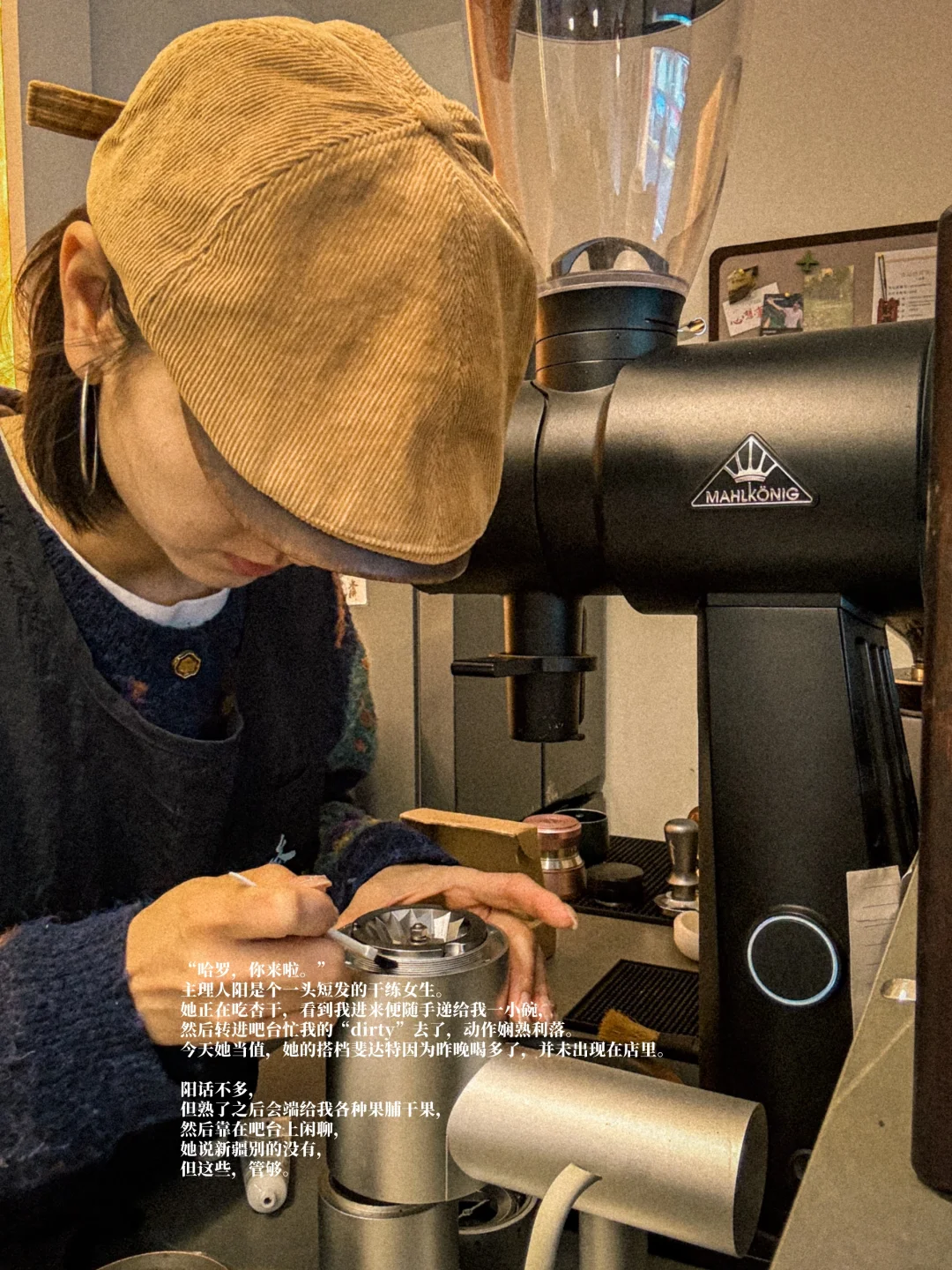 “哈罗,你来啦,”主理人阳是个一头短发的干练女生,她正在吃杏干,看到我进来便随手递给我一小碗,然后转进吧台忙我的“dirty”去了,动作娴熟利落。今天她当值,她的搭档斐达特因为昨晚喝多了,并未出现在店里。