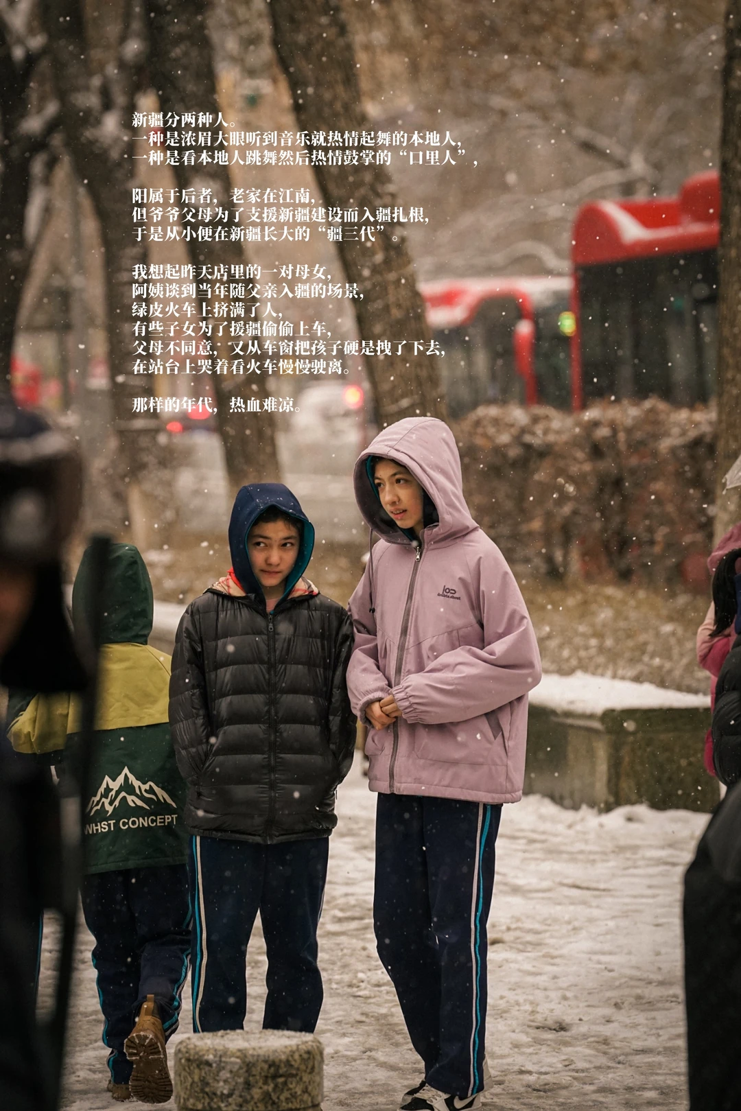 这里有两种人,一种是浓眉大眼听到音乐就热情起舞的本地人,一种是看本地人跳舞然后热情鼓掌的“口里人”,阳属于后者,老家在江南,但爷爷父母为了支援建设而入西域扎根,于是从小便在这里长大的“疆三代”。我想起昨天店里的一对母女,阿姨谈到当年随父亲来此的场景,绿皮火车上挤满了人,有些子女为了远赴西域偷偷上车,父母不同意,又从车窗把孩子硬是拽了下去,只能在站台上哭着看火车慢慢驶离月台。