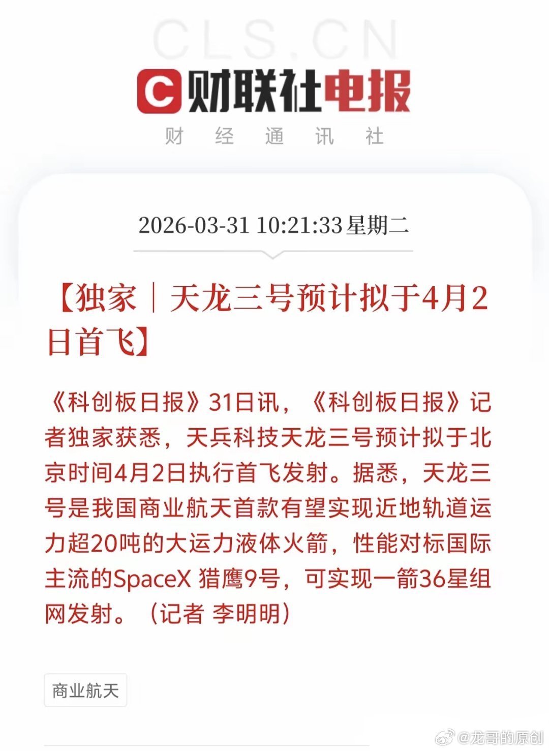 据科创板日报3月31日独家消息:天兵科技天龙三号,定在4月2日首飞!+商业航天概念全梳理,建议收藏起来这可不是普通火箭——它是国内商业航天首款近地轨道运力超20吨的大运力液体火箭,直接对标SpaceX猎鹰9号,还能一箭36星密集组网发射,堪称我国商业航天的里程碑级大突破。🔥 这次首飞,到底有多牛?- 运力直接拉满:20吨级大运力,目前国内商业航天里规划最大- 效率碾压:一箭36星,低成本、高组网,一次顶过去好几次- 解决行业痛点:补上大运力火箭缺口、降低发射成本、加快卫星互联网建设- 意义重大:给我国卫星互联网、商业航天任务,打下自主可控的硬底气💡 利好直接带火整条产业链火箭量产+发射放量,会直接带动:火箭研制、卫星制造、航天动力、航天电子、卫星应用全产业链扩容升级,商业航天正式进入规模化提速期。📌 核心受益公司一览1. 中国卫星卫星制造+应用龙头,火箭运力提升、发射成本下降,直接受益2. 邵阳液压航天液压核心配套,火箭发射越多,公司订单越稳3. 航天环宇航天精密零部件+复材供应商,深度绑定多款商业火箭4. 天银机电星敏感器核心厂商,卫星组网加速,需求直接放量5. 铂力特航天3D打印龙头,火箭、卫星轻量化制造核心配套一句话总结:天龙三号首飞,不只是一枚火箭升空,更是中国商业航天正式对标国际一线的关键一步,整条产业链都要吃红利!