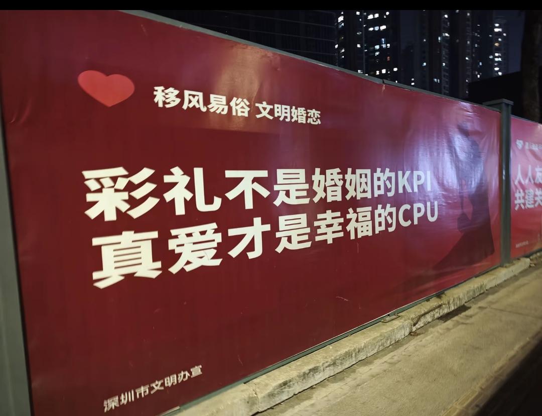 深圳是一个公益宣传栏的广告,上面两个字被人挖走了! 这个是宣传移风易俗的公益广告,公益广告的内容是“彩礼不是婚姻的KPI,真爱才是幸福的ICU”。 绝大多数生活幸福,家庭美满,夫妻和睦的人不会觉得这一个公益宣传栏有任何的歧义,大家是怎么看待这种现象的,欢迎评论区留言。