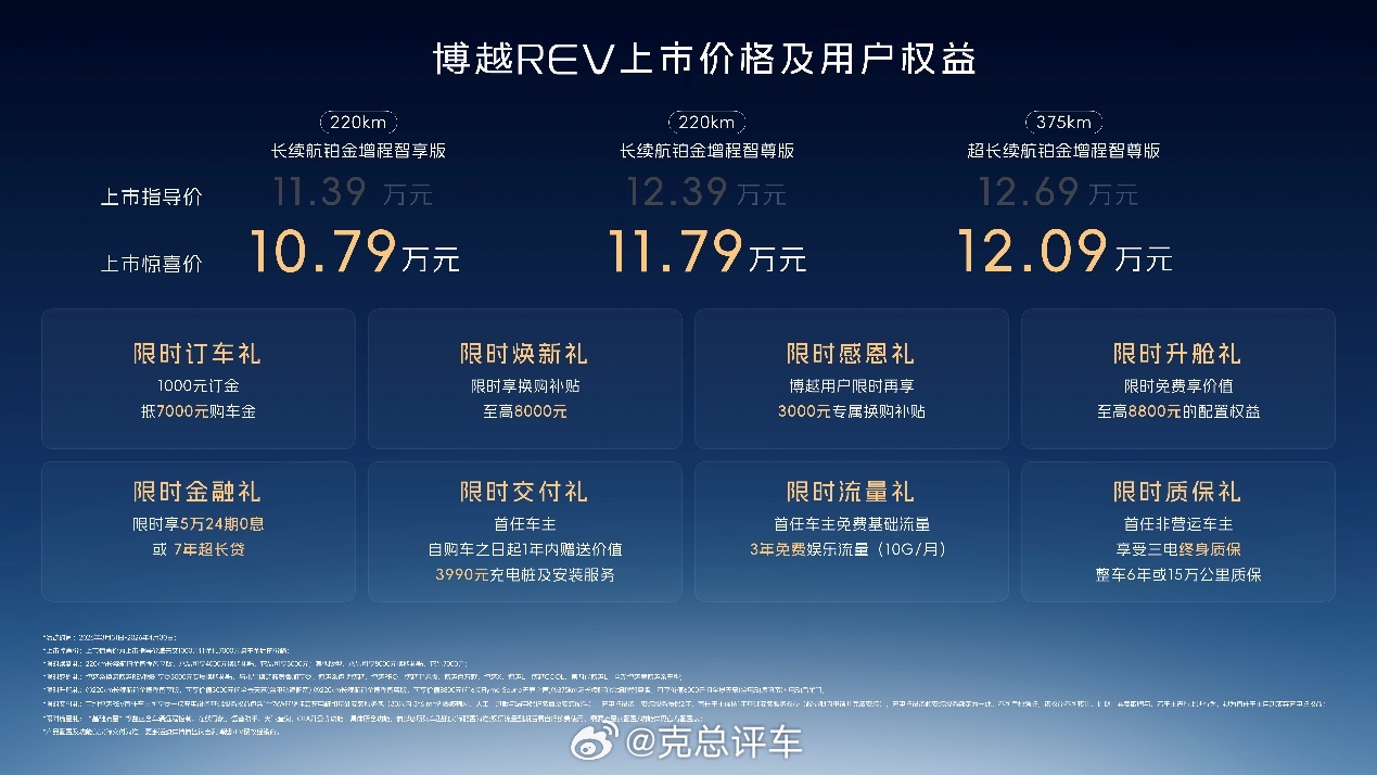 3月31日,吉利借博越十周年契机,在杭州全球发布新一代长续航增程SUV博越REV。该车以10.79万-12.09万元惊喜价,直接拉平A+级增程门槛,开启长续航增程平权时代。