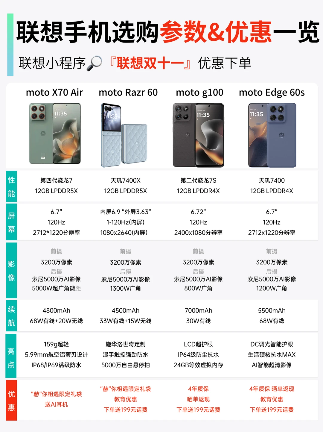 moto最强LCD护眼屏,硬件级防蓝光无频闪;7000mAh超大电池,moto史上最强续航;IP64级防尘抗水,湿手触控2.0,四年质保;索尼5000万AI影像+3200万超清前摄,前后都出片。适合注重护眼需求,长续航需求者,日常通讯娱乐。