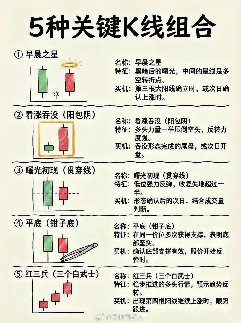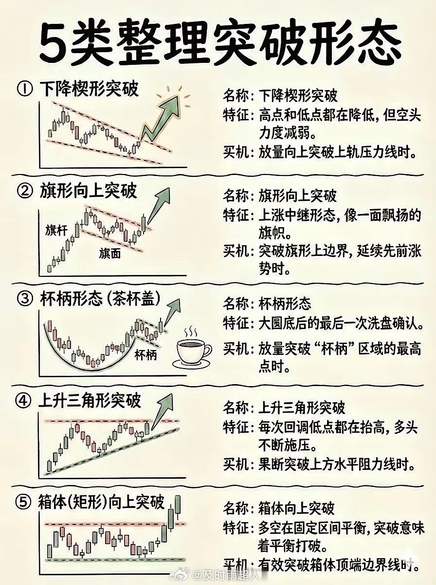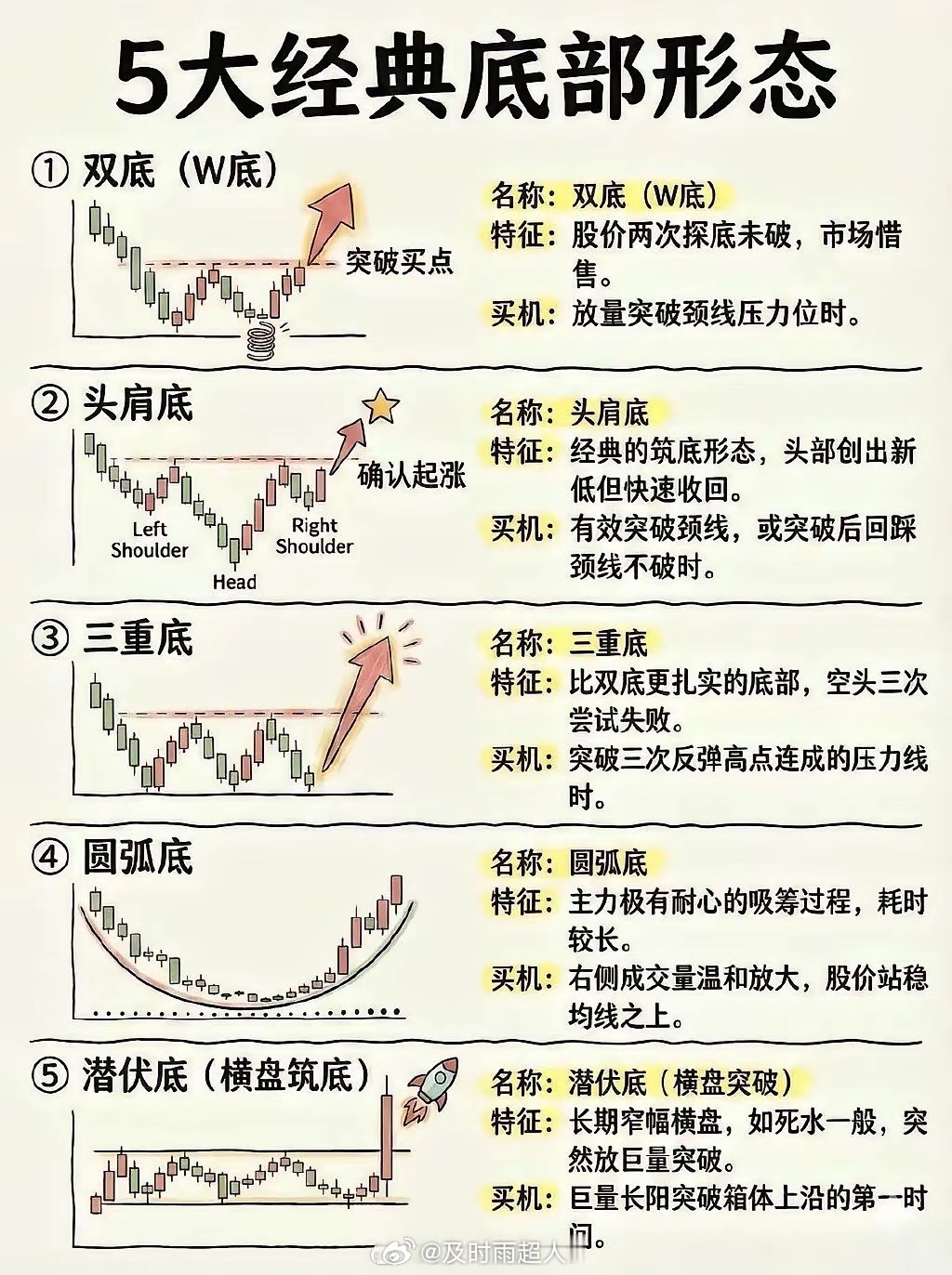 炒股想稳定盈利,得懂这25种股票起涨形态。这25种形态可分成五类。底部反转类是抄底机会,像W底,两个相近低点和中间反弹高点形成颈线,二底缩量、突破颈线放量就是买入信号;头肩底右肩缩量、突破放量,反转概率高。中继整理类是上涨中途蓄力,如杯柄形态,杯部回调不超33%,柄部小回撤,突破柄部高点起涨。K线组合类是短期爆发信号,多方炮两阳夹一阴,第三根阳线创新高,多头强势。掌握这些形态,能更好判断股票走势,抓住起涨时机,在股市吃肉。