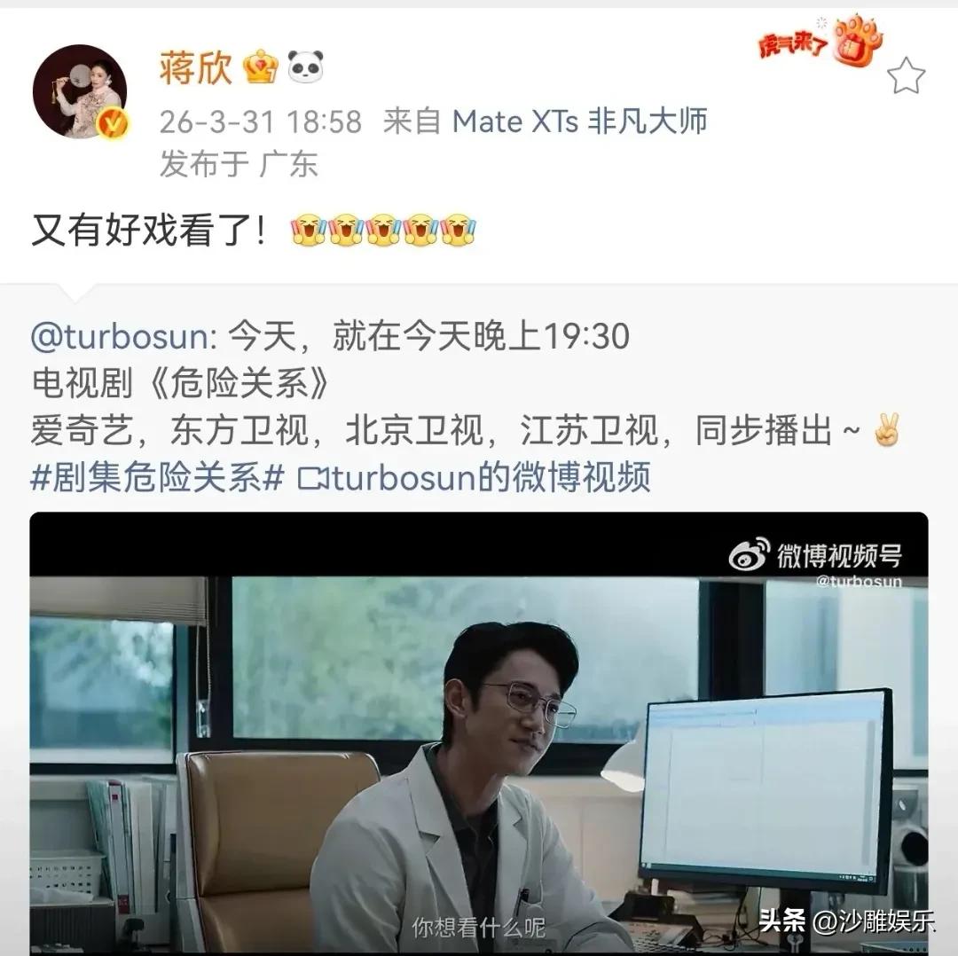 蒋欣,深夜高调发文! 3月31日,平日里几乎不怎么更新动态的蒋欣,却在社交平台上高调了一把——仅仅6个字,却让网友直呼“这对姐妹情我磕到了”! 原来,蒋欣这是在为好姐妹孙俪的新剧《危险关系》站台。她先是转发了孙俪的宣发博文,随后激动配文“又有好戏看了!”,还加了一连串欢呼雀跃的表情包。这波操作,直接把“追剧搭子”的属性拉满,让不少网友笑称:“蒋欣这是蹲点等开播吧?也太真实了!” 说起蒋欣和孙俪的友情,在娱乐圈这个大染缸里,实属难得。两人因戏结缘,多年来一直低调维系着这份情谊。 这次蒋欣主动转发宣传,而且还是掐着点的“追剧式安利”,既给新剧开播添了一把火,也让观众看到了她们之间实打实的情谊。毕竟在这个谁红跟谁玩的圈子里,能这样主动为好友站台的,真的不多了。 孙俪这次带来的《危险关系》,可以说是排面拉满——当晚19:30同步登陆爱奇艺、东方卫视、北京卫视、江苏卫视四大平台。这阵仗,摆明了是要搞大事情! 从已经放出的预告片段来看,孙俪在剧中的状态绝了。一个眼神,一句“你想看什么呢”,配合着细腻入微的表情变化,氛围感直接拉满。 那种角色的复杂感和故事的张力,隔着屏幕都能感受到。不少网友看完预告就坐不住了:“孙俪的演技真的从来没让人失望过”“这眼神,我已经开始期待了!” 蒋欣这波宣传,效果也是立竿见影。话题度蹭蹭往上涨,网友纷纷在评论区留言:“这波安利我吃定了!”“蹲点开播,坐等颜玲(孙俪角色名)登场”“蒋欣都这么激动了,那必须得看啊!” 说实话,在这个各路明星都在抢流量的时代,真正能让人期待的作品反而越来越少了。但孙俪不一样,她选剧本的眼光和演技的保障,早就成了观众心中的金字招牌。而蒋欣这次真情实感的“为友打call”,更是让这场开播盛宴多了几分人情味。 如今《危险关系》已经开播,四大平台同步播出,孙俪能否凭借这部剧再掀收视狂潮?蒋欣会不会继续在线追剧、实时剧透? 这波“神仙友情”的宣传攻势,着实让人对接下来的剧情走向和热度走势,充满了期待!