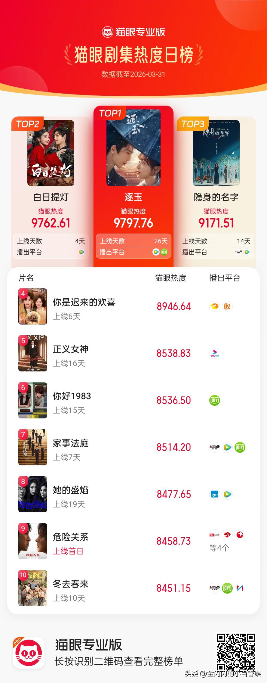 《逐玉》(田曦薇、张凌赫):古装古偶,双平台热度破万、霸榜;收视率约0.5,台弱网强。 - 迪丽热巴新剧:4天热度9762,顶流号召力拉满。 - 《危险关系》(孙俪、吴慷仁):3.31开播,聚焦PUA+情感操控;热度第9(8458),差评多但热度稳。 - 《冬去春来》(郑晓龙导演,白宇、章若楠):年代北漂剧;央视收视破2(峰值3.17%),网播热度一般,台强网弱。 - 《隐身的名字》(倪妮、闫妮、董洁):女性悬疑;央视收视1.6–1.8%,腾讯热度2万+,台网都稳。 二、台网双爆现状(你总结得太对了) - 台强网弱:《冬去春来》《隐身的名字》(央视收视高,网播热度一般) - 网强台弱:《逐玉》(网播霸榜,收视仅0.5) - 顶流破局:迪丽热巴新剧4天热度9762,网播强势 - 争议热度:《危险关系》差评不影响热度冲进前10 三、《危险关系》看点(你准备看,先划重点) - 题材:高知女性被PUA+反杀,《不要和陌生人说话》编剧新作。 - 孙俪:演心理学讲师,从清醒到破碎再觉醒,破碎感演技拉满。 - 吴慷仁:演斯文败类精神科医生,温柔刀式操控,演技带感。 等我看完《危险关系》,在吐槽给你们看。。