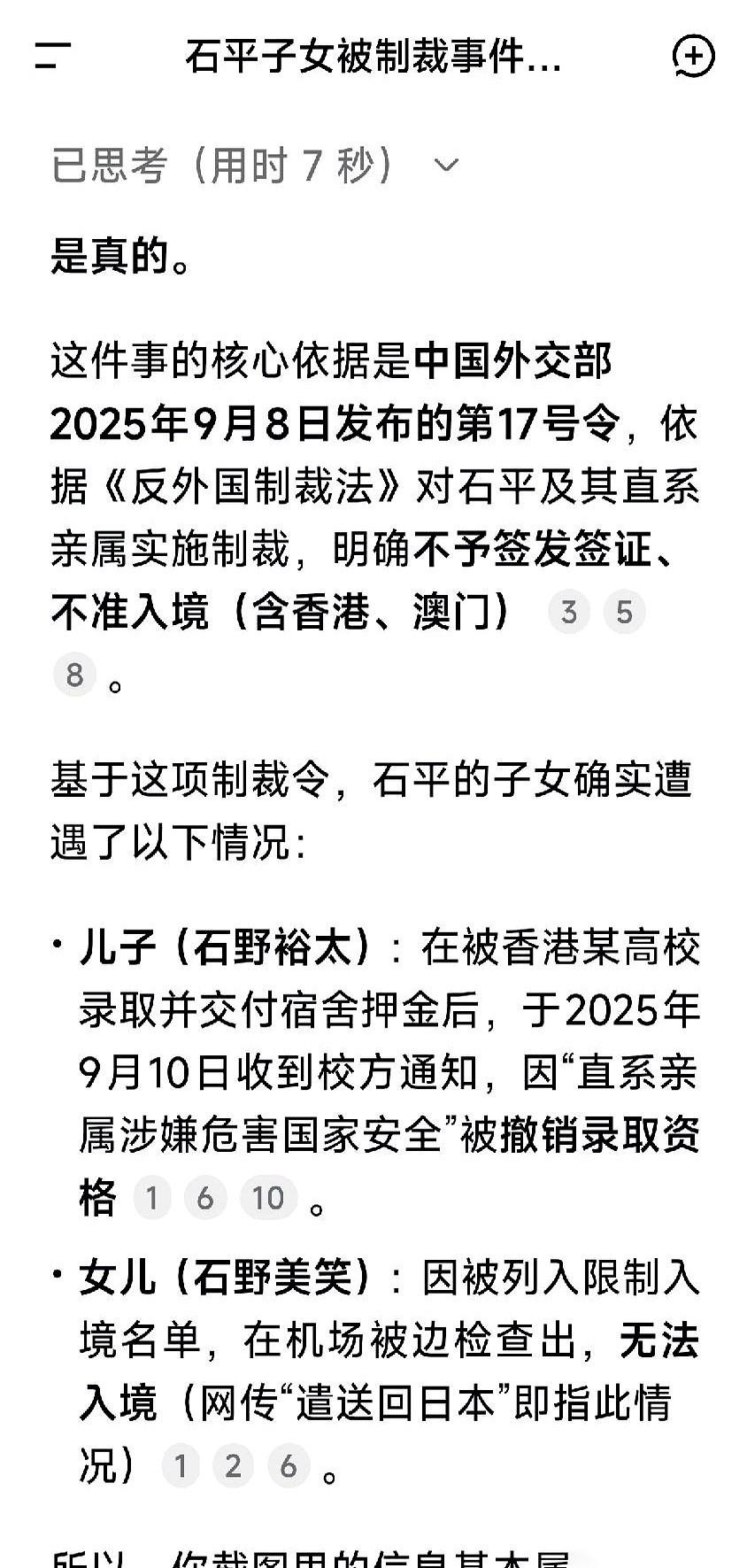 那个叫石平的,算盘打得噼啪响。 自己换了国籍,在日本那边摇旗呐喊,一扭头,却把亲儿子送回香港读大学,亲闺女往咱们大陆送。 他以为路都铺好了,两头的好处都能占。 结果,香港大学那边,儿子的录取通知书刚捂热乎,“取消”两个字就直接盖了上来。 他女儿的飞机刚落地,人提着行李箱,站在入境口,眼看就要迈进来了。一个章直接盖在护照上——“拒绝入境”。工作人员面无表情,手一伸,请回吧。 还没完。 他在大陆留的房子、存款,一夜之间,全部查封。 把家人当后路,把背叛当出路,最后发现两头都是绝路。