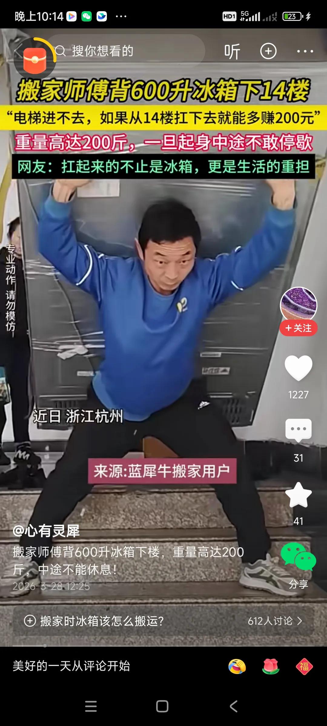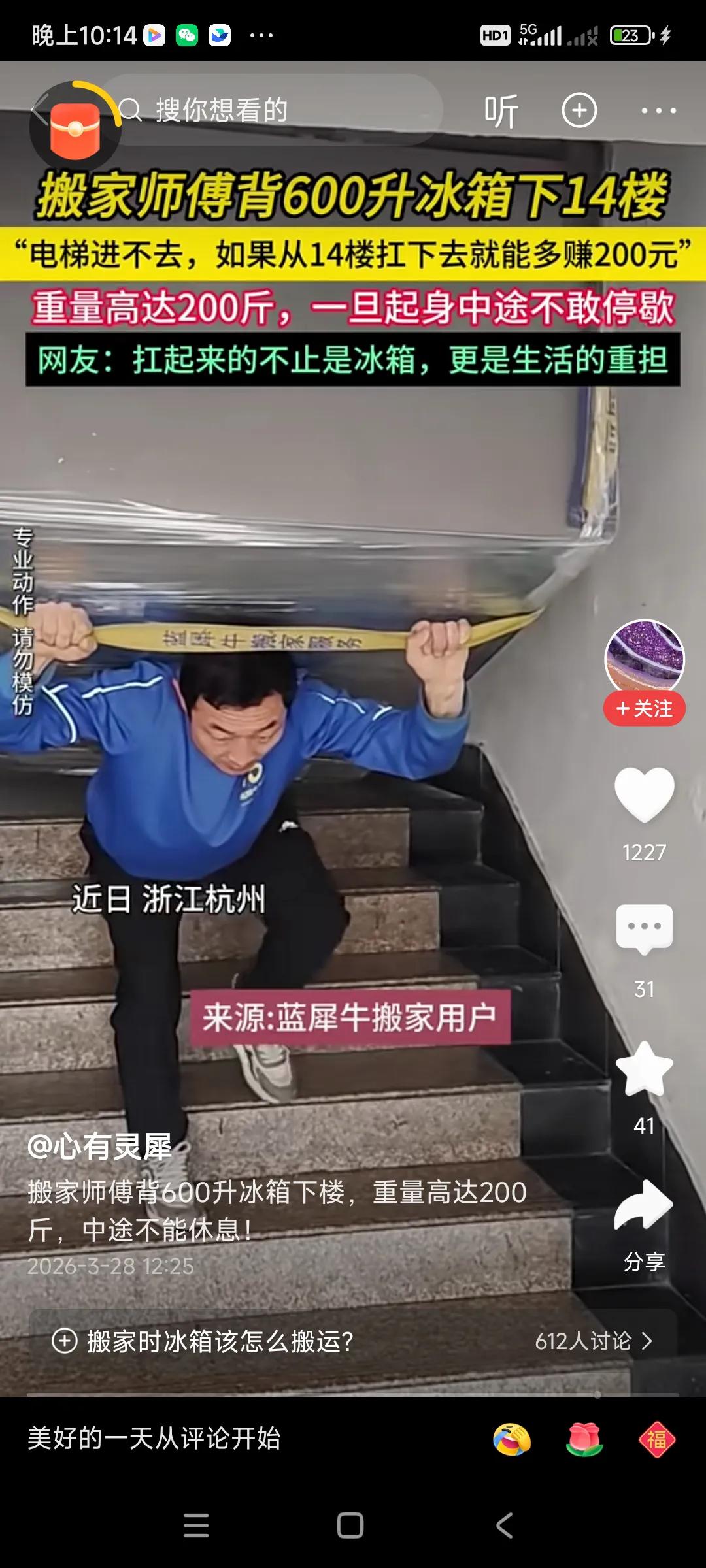 这个搬运工自身体重最多150斤,却能背起200斤的冰箱,肯定是用尽了全力,看了心惊胆战,, 从14楼,背到楼下,挣了200元,太累了,,我二十年前送过家电,背过小冰箱,110升的,大概80多斤,有个东北同事,他体力好,能背150斤的大冰箱上八楼,也不轻松,衣服汗湿了,客户有的不错,送瓶饮料,有的香港人给个十元,二十元小费,,,你不要,人家会生气,[捂脸][捂脸] 为了生活,什么苦都要吃,没办法,, 还是多学习才行,用脑子挣钱,轻松一点,同事的女儿搞培训,一小吋300元,轻轻松松,,, 这要是外卖小哥,要风吹雨淋,干十个小吋,才能挣到300元,还不能有差评,,,