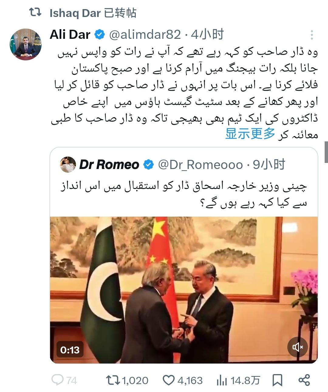 4月1日,巴基斯坦外长达尔在访华期间,除了与中方共同发布了关于海湾与中东稳定的5点倡议之外,还有一个非常令人暖心的桥段,那就是中方关于达尔肩部伤势的特殊安排。 这则消息是由达尔外长的儿子阿里·达尔(Ali Dar)发表的,并且被达尔外长所转发了。根据他的讲法,达尔本来准备在当天会见完就立刻返回巴基斯坦。但中方成功地劝说了达尔,让他能够从自己的身体健康考虑,在北京休息一晚,第二天才返回。 此外,在晚饭结束之后,中方还特别安排了专业的医生,前往钓鱼台国宾馆,为达尔的伤势进行检查。这显然也再度展现出了中巴之间的特殊友谊。达尔和他的儿子发表了这条消息,也是向巴基斯坦国内和国际社会展现中方与其他国家相处的方式,以及平等互信的态度。 实际上,这次的中东问题也非常复杂,并不是发表一个五点倡议就能够解决问题的。但对于中方来说,在这个关键的时间点,彰显自己的存在,展现自己的态度也同样重要。从目前国际舆论的反应来看,基本都高度赞赏这五点倡议,以及对中国倡议的期待。可以说在当前的大变局之下,中方已经展现出了与美国截然不同的外交路线和姿态,这一点也会推动中、美国际对比潜移默化的转变。这一点对于中方来说,恐怕才是最重要的。