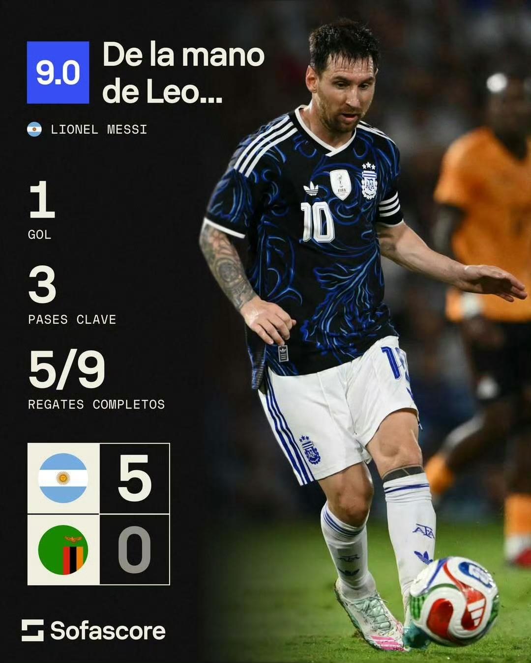 阿根廷5-0战胜赞比亚赛后,全场最佳梅西统计数据如下: ⚽一个进球 🔑 3次关键传球(全场最多) ✅ 63次成功传球 💪赢得6次对抗 💨 5次成功过人(全场最多) 💯评分 9.0 赛中精彩瞬间:上半场,第一球梅西反越位助攻阿尔瓦雷斯,帮助阿根廷完成开场4分钟进球,随后接队友传球,在狭小的空间和角度内,完成破门,自己个人进球数来到902球。 下半场,阿尔马达造点,第一点球手梅西,主动让点给老兄弟奥塔门迪,后者进球后,第一时间拥抱并抱起梅西,随后赛中梅西两场穿裆过人,最后一球,梅西快发,刚皇助攻巴尔科破门,阿根廷5-0赞比亚,国际比赛日,完美收官。 赛后梅西获评9.0分,全场最佳球员。