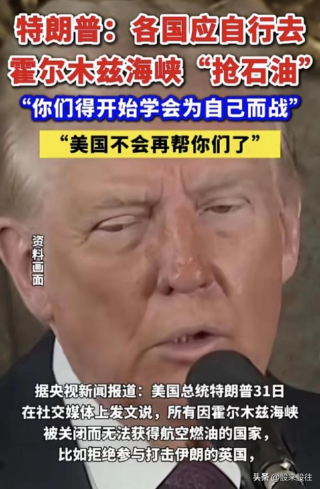 金毛——各国应自行去霍尔木兹海峡“抢石油”,“你们得开始学会为自己而战”“美国不会再帮你们了”。