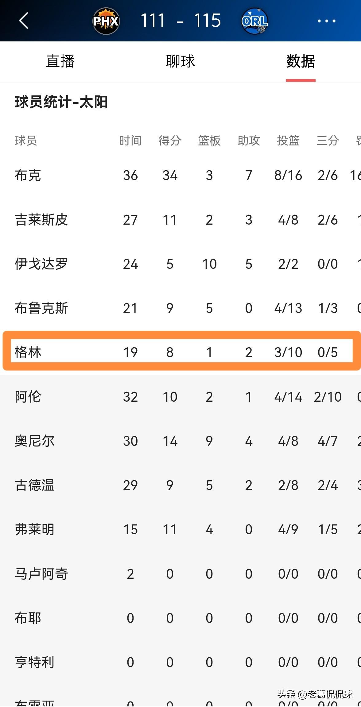 太阳二当家杰伦-格林真是活该被冷落!在今天太阳客场以111:115不敌魔术的比赛中,杰伦-格林由于状态过于糟糕而遭到了球队的冷落,仅仅首发出战了19分钟。 整场比赛下来,杰伦-格林首发出战19分钟,投篮10中3,其中三分球5中0、罚球2中2非常低效的得到8分,还有4次失误。 实事求是的说,作为太阳的进攻核心之一,本场比赛杰伦-格林的状态确实太低迷了,因此他的出场时间被主帅大幅度的缩短也在情理之中。