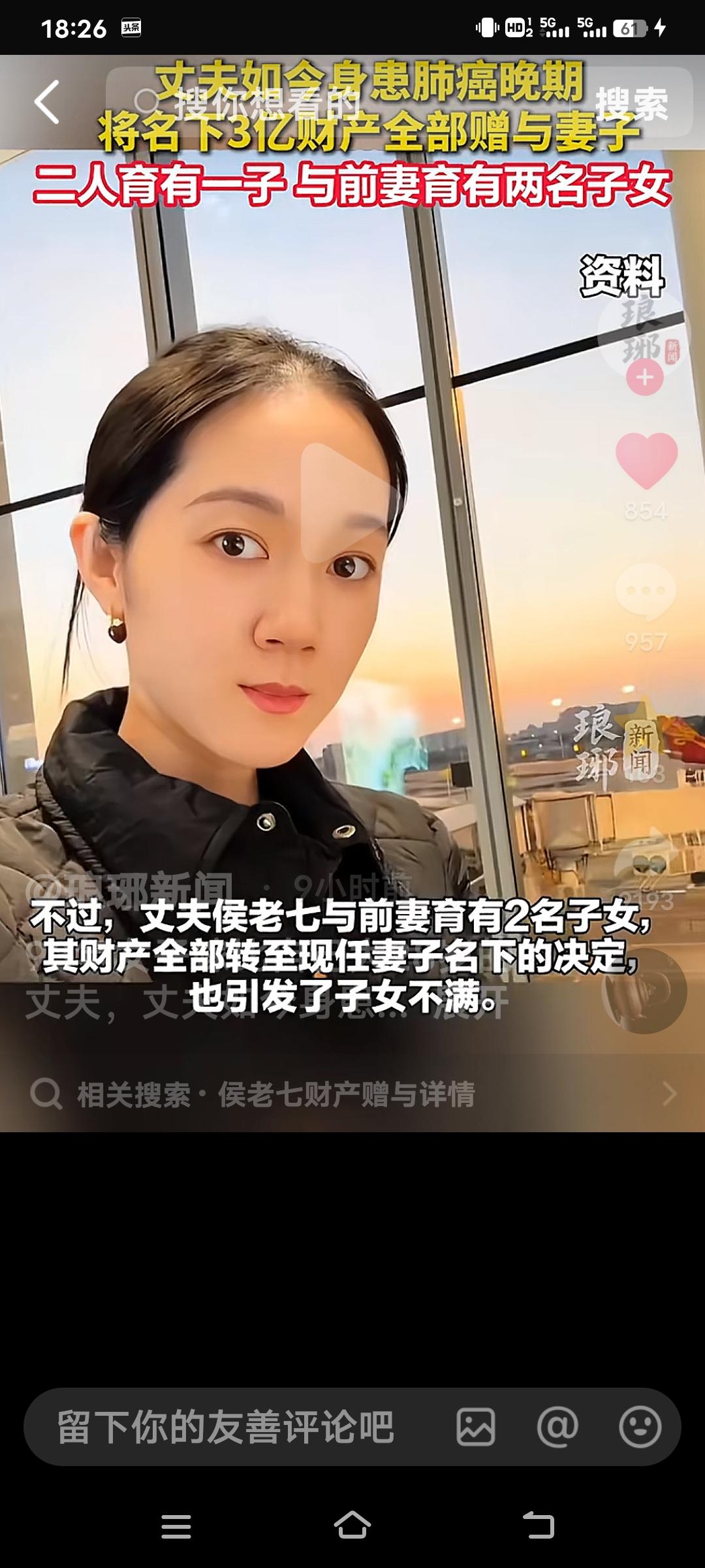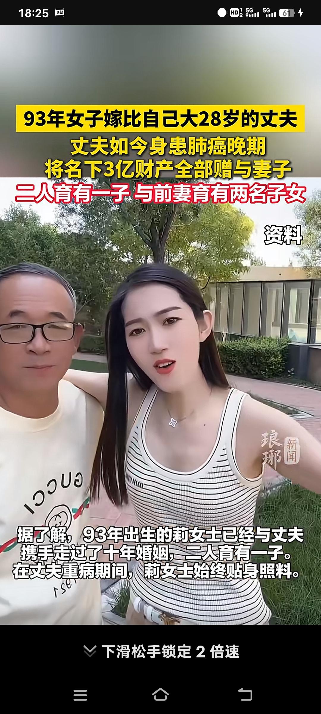 三亚的侯先生罹患肺癌晚期,将3亿财产赠予小他28岁的妻子,此事引发广泛关注。据报道,1993年出生的莉女士与丈夫携手走过十年婚姻,还育有一个儿子。在丈夫病重期间,她贴身照料,陪伴丈夫完成5次化疗,这份付出着实令人称赞。 然而,丈夫与前妻的两名子女对财产全部给予现任妻子一事颇为不满。这也在情理之中,毕竟涉及巨额财产。但莉女士表示自己从未主动提及财产,日后还会继续陪伴丈夫养病。 她的深情打动了无数人,当初她不顾父母反对嫁给大28岁的侯先生,十年来始终不离不弃。面对前妻孩子对遗产分配的不满,侯先生直言:“这些年我生病时你们在哪里?”让他们无言以对。肺癌专家宋莉 肺癌家属互助 家族性肺癌