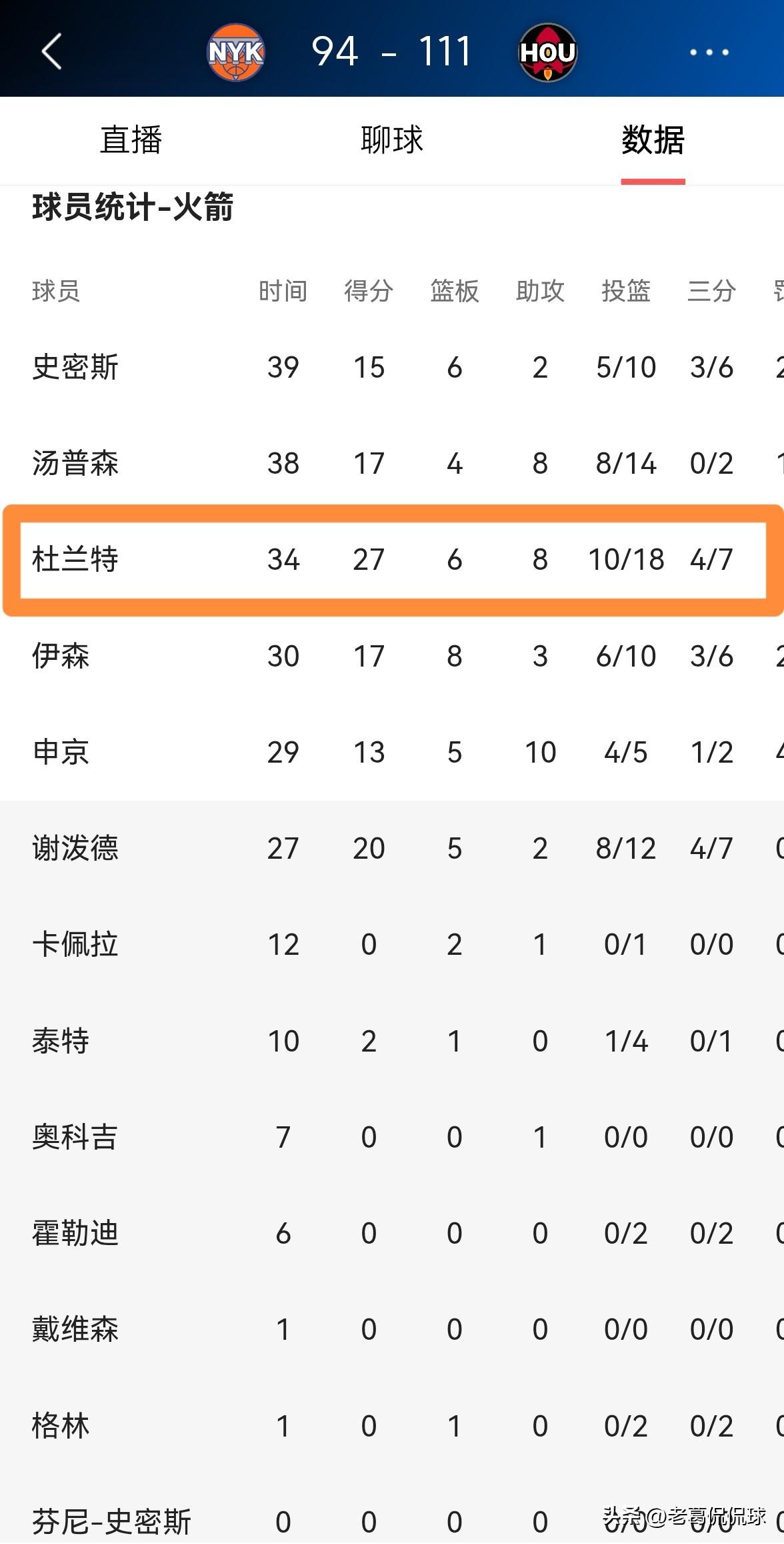 火箭巨星杜兰特终于带领球队击败强队了!今天火箭在主场以111:94轻取东部劲旅尼克斯,取得了一场酣畅淋漓的大胜,这样的话,杜兰特终于证明自己拥有带领球队击败强队的能力。 全场比赛下来,杜兰特首发出战34分钟,投篮18中10,其中三分球7中4、罚球4中3相当高效的砍下27分,外加6篮板8助攻2盖帽,他的场上正负值为球队最高的+28。 本场比赛过后,我相信当今联盟的强队再也不会小看火箭和杜兰特了。