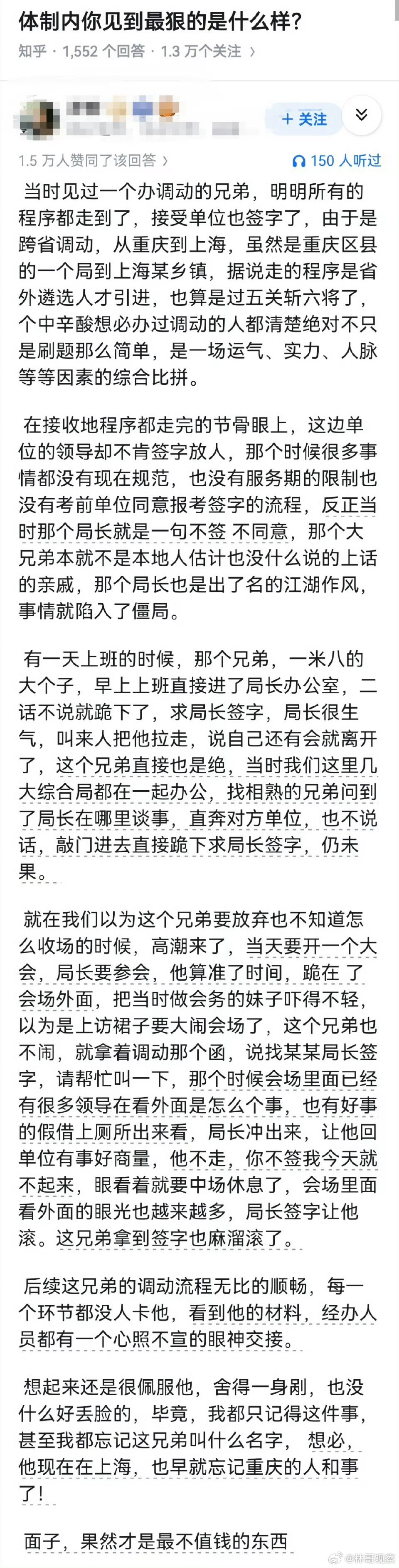 我吃柠檬 3 2026-04-01 17:16 我们以前国企单位一个女同事,一直希望调到总公司后勤部门,不愿意在其它部门,一上班天天守着领导,领导开会她在门外等,领导上厕所就在厕所外面等,啥都不闹,就是守着。说她 骂她,她也不走,耗了一个月,领导没办法只得同意