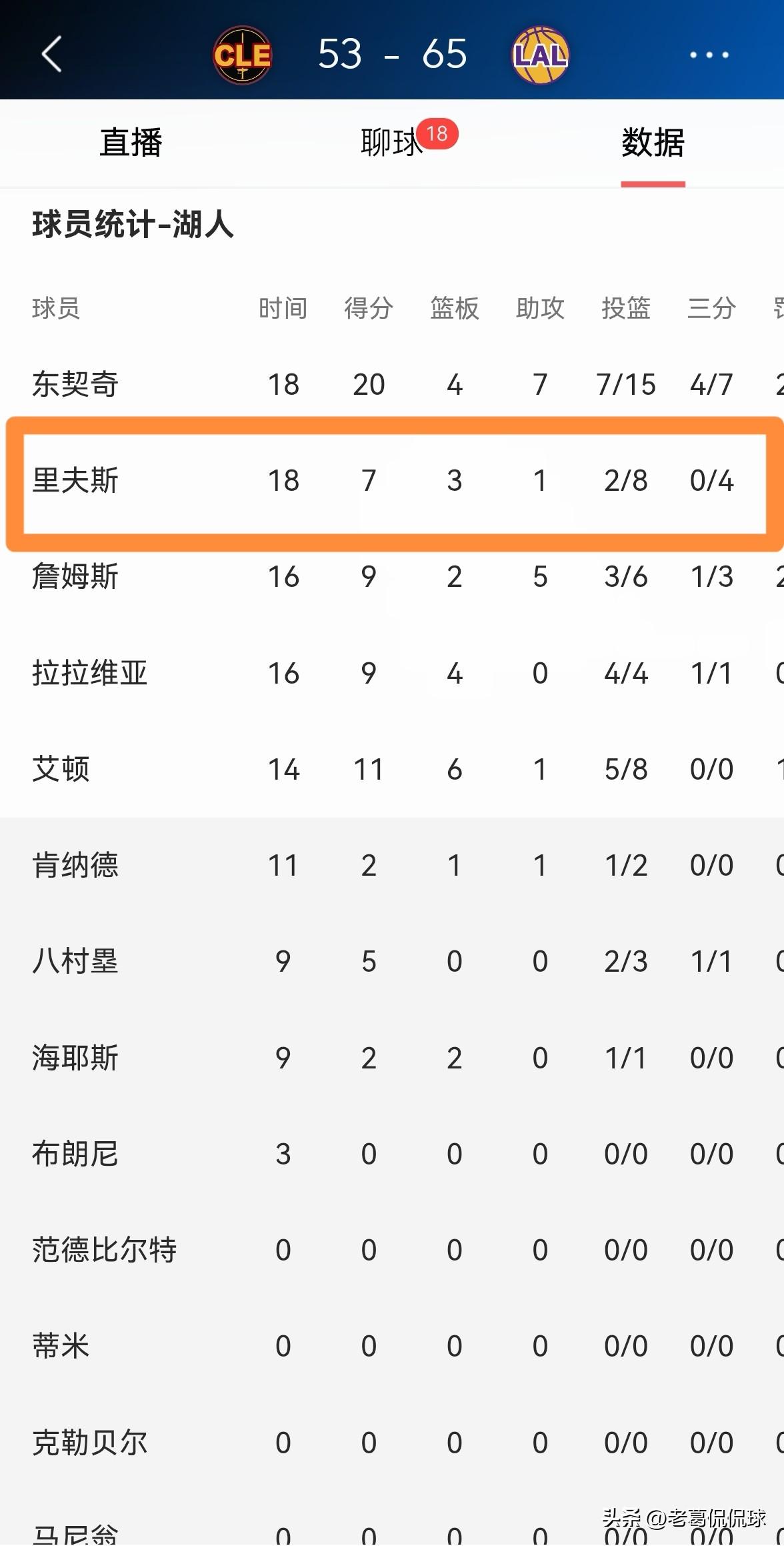 湖人超级后卫里弗斯真是一碰强队就拉胯!在今天湖人主场迎战骑士的强强对话中,目前双方半场战罢,虽然湖人以65:53处于领先,但是里弗斯的表现却非常的拉胯。 在前两节比赛中,里弗斯首发出战18分钟,投篮8中2,其中三分球4中0、罚球3中3非常低效的得到7分,还出现了3次失误。 坦白说,湖人在季后赛中绝对指望不上里弗斯,因为里弗斯只要遇到强队就会习惯性拉胯。