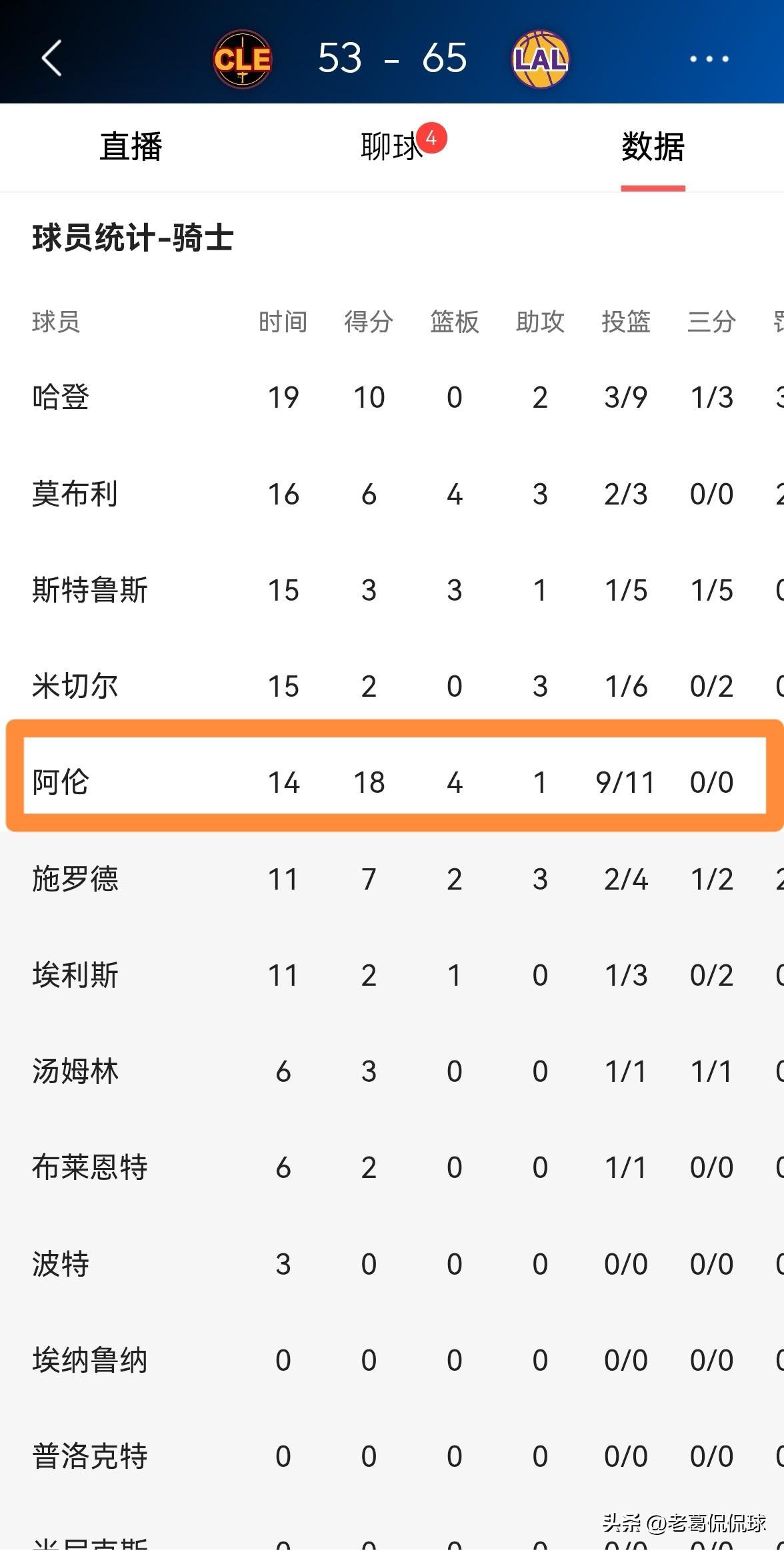 骑士当家中锋阿伦真是予取予求!在今天进行的骑士和湖人的比赛中,目前双方半场战罢,虽然骑士以53:65处于落后,但是阿伦却打出了予取予求的表现。 在前两节比赛中,阿伦首发出战14分钟,投篮11中9极其高效的砍下18分,还有4篮板1助攻。 以阿伦在上半场比赛中的火热状态来看,本场比赛即便骑士最终输掉了比赛,阿伦依然能够轻松打出30+10的表现。