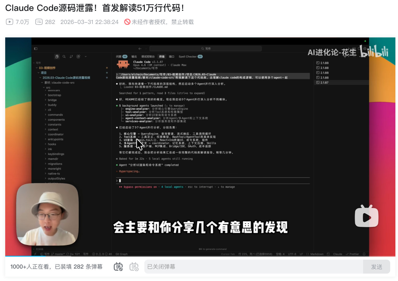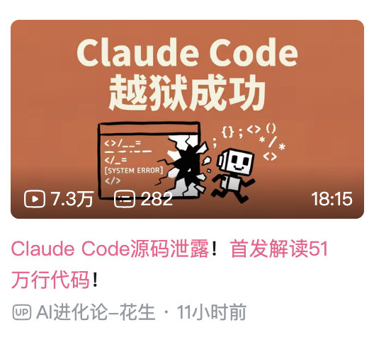 Claude Code 源码意外泄露 好家伙,开发者在源码里还偷偷养了一只宠物?我听说Claude Code的npm包里意外留了一个60MB的调试文件,导致1902个源文件、51万行TypeScript代码全部暴露。小破站上的up主AI进化论-花生 已经把文件 fork 下来,还直接用 Claude Code 自己解读自己,挺会玩的。这次泄露之后,Auto 模式的双 AI 驱动机制、四层安全审查、专属 prompt 全被扒干净了,记忆系统、搜索逻辑也没藏住。博主还借着 Claude Code 自己把系统提示词怎么拼、四层安全审查到底怎么运作、只记偏好不记代码的记忆系统这些都理了一遍。那相当于官方没开的内部文档,被源码直接补上了。有兴趣的兄弟可以去翻花生的视频细看,反正代码已经在外边了,当个技术拆解看真的超值了!Claude用户激增