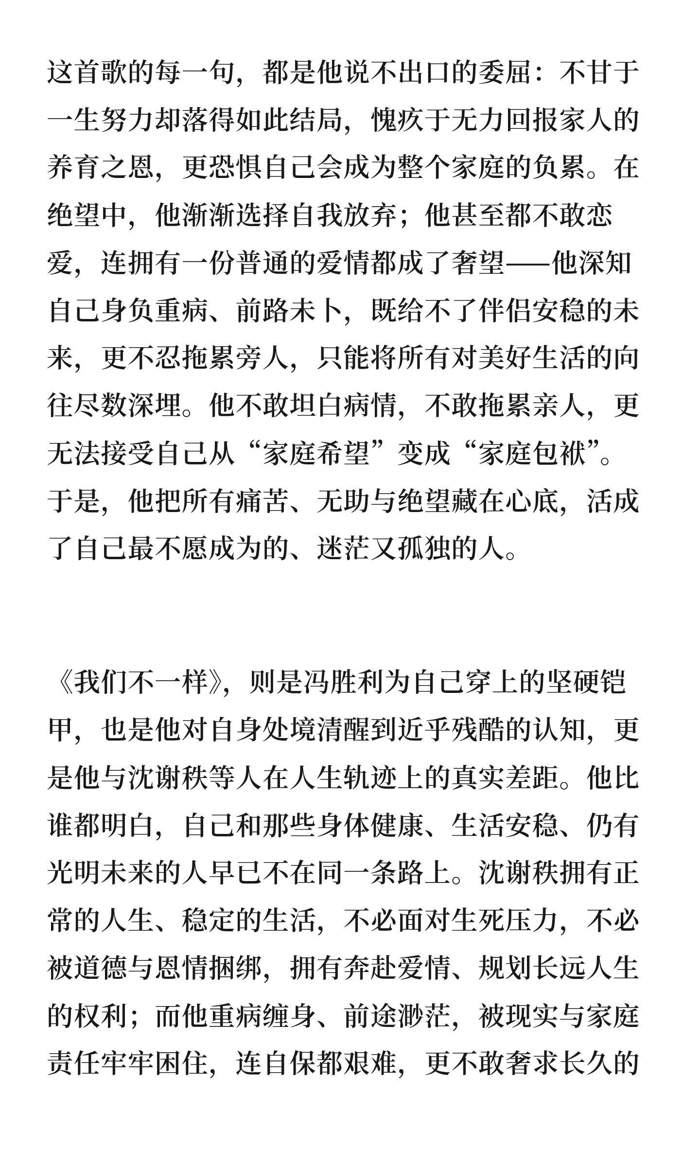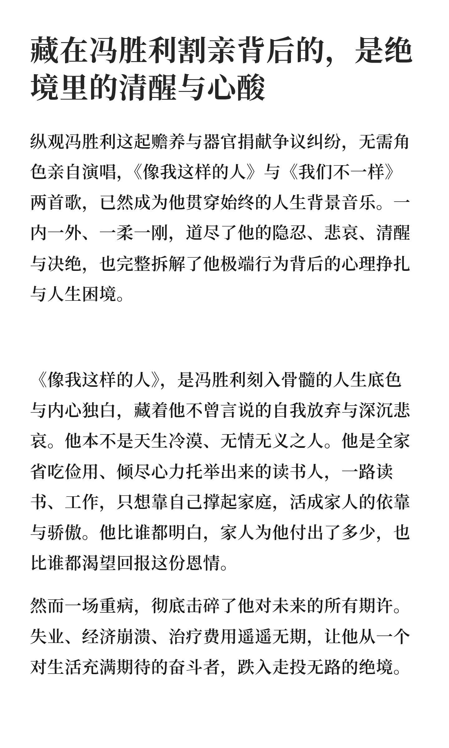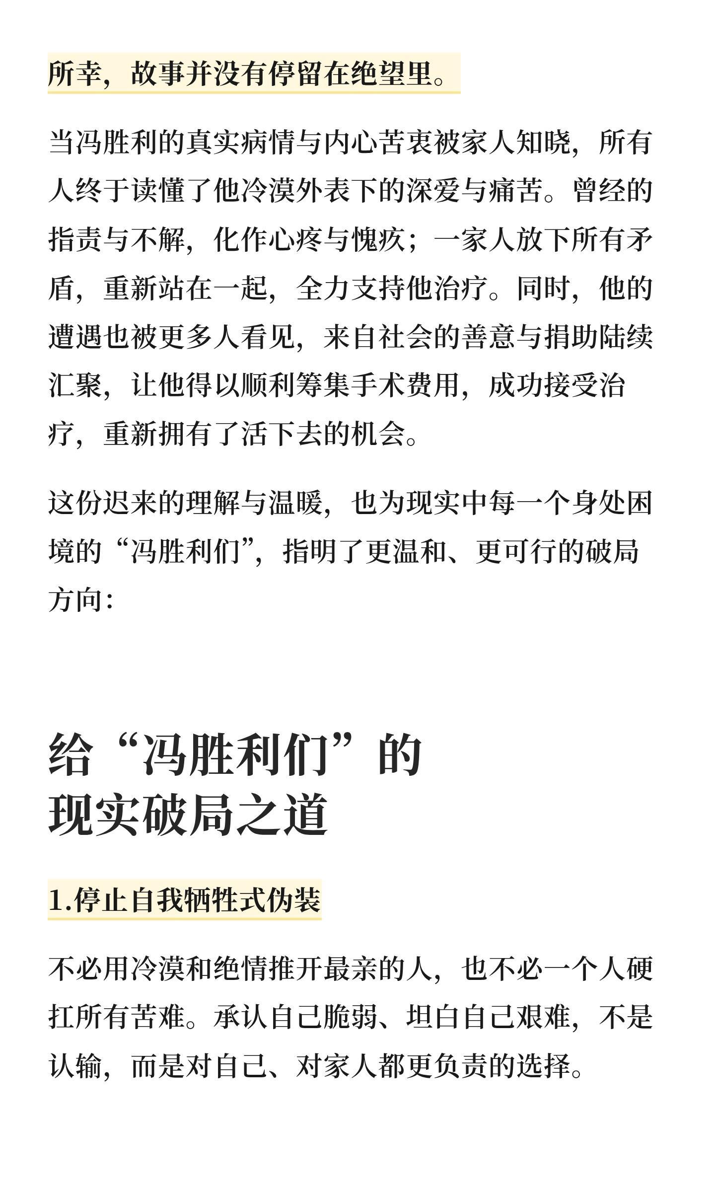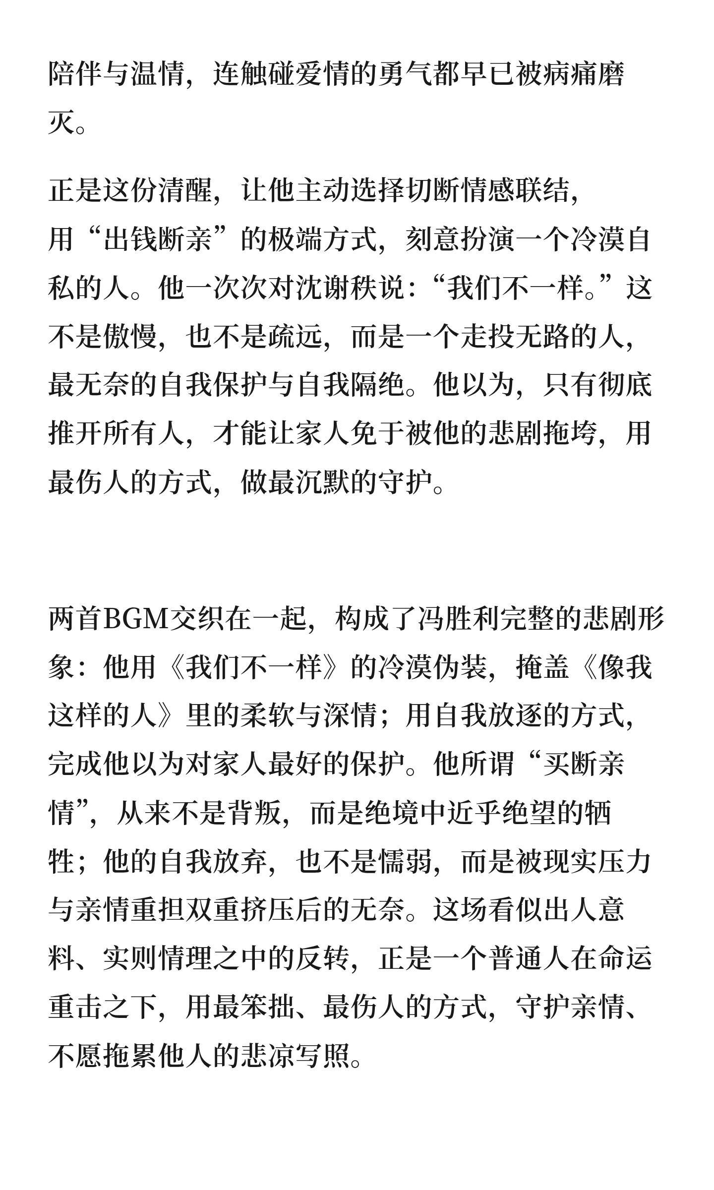 龚俊《家事法庭》高质量剧评,其实现实生活中不乏冯胜利这样的人,冯胜利不幸的,承载着全家的希望眼看要见到光了却又疾病缠身,搁谁谁崩溃。但某种情况下也是幸运的,因为还有人没有家人托举没有出头的机会没有人能沟通,在逼仄阴暗潮湿的角落独自生病死去,现实很残忍。这剧拍得真的太真实了,很多案例都是真实生活的缩影家事法庭