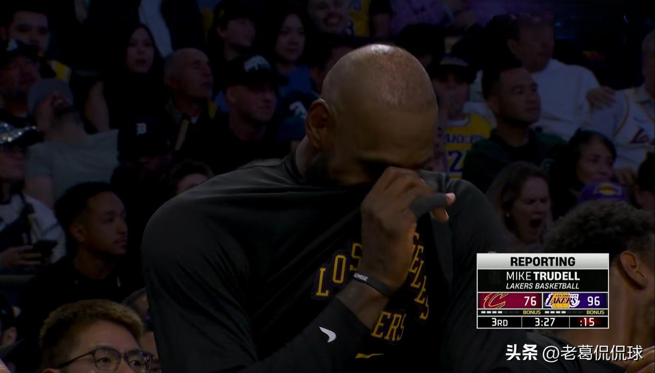 湖人超级球星詹姆斯真是太幸灾乐祸了!在今天湖人主场迎战骑士的比赛中,当时比赛进行到了第三节的三分多钟,骑士大将施罗德在一次防守回合中被裁判吹罚了对里弗斯的犯规,正当施罗德和裁判进行交流的时候,转播镜头给到了湖人的替补席,只见詹姆斯在场下笑得合不拢嘴,给人一种幸灾乐祸的感觉。值得一提的是,詹姆斯为了防止被摄像机拍摄到,竟然还用衣服捂住了自己的嘴巴。
