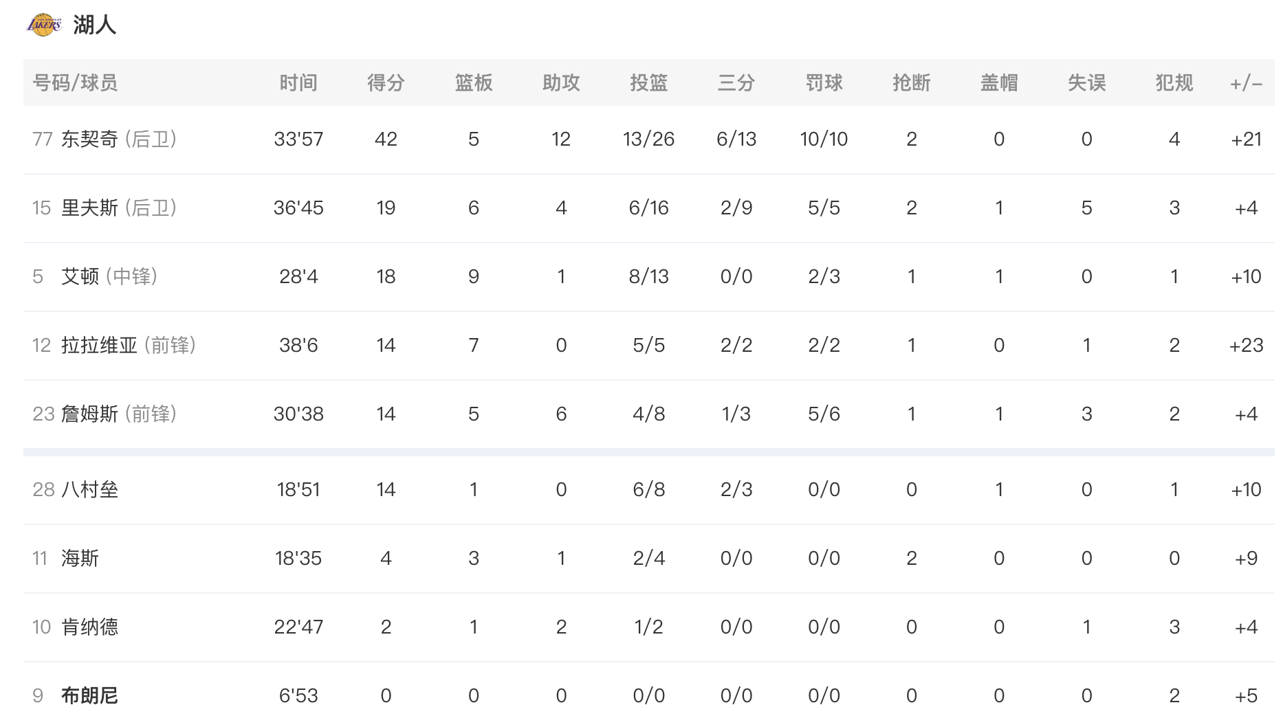詹姆斯14分5篮板6助攻1抢断1盖帽,东契奇42分5篮板12助攻2抢断,里夫斯19分6篮板4助攻2抢断,拉拉维亚14分7篮板,艾顿18分9篮板,八村14分,肯纳德2分2助攻,海斯4分3篮板2抢断。