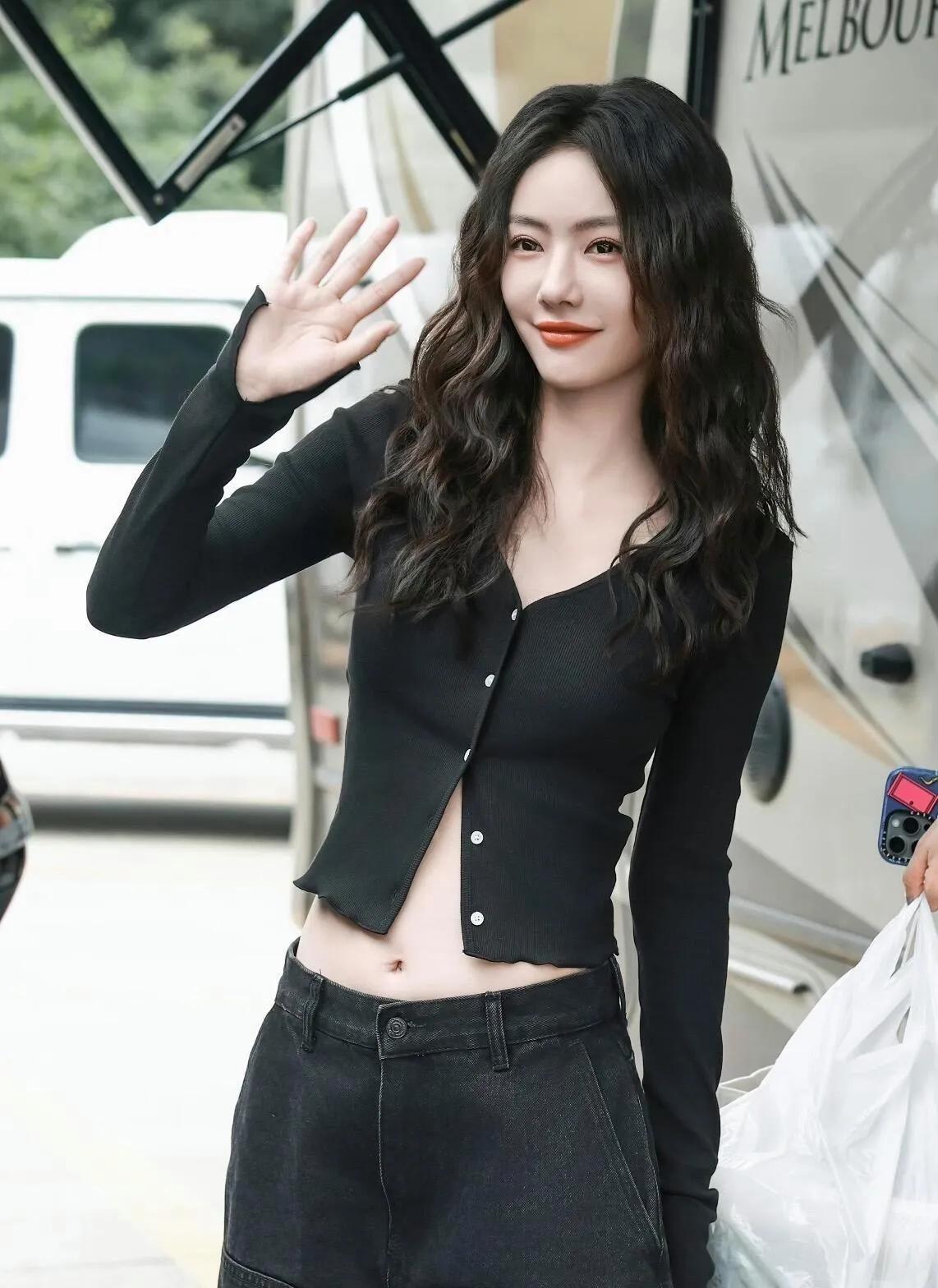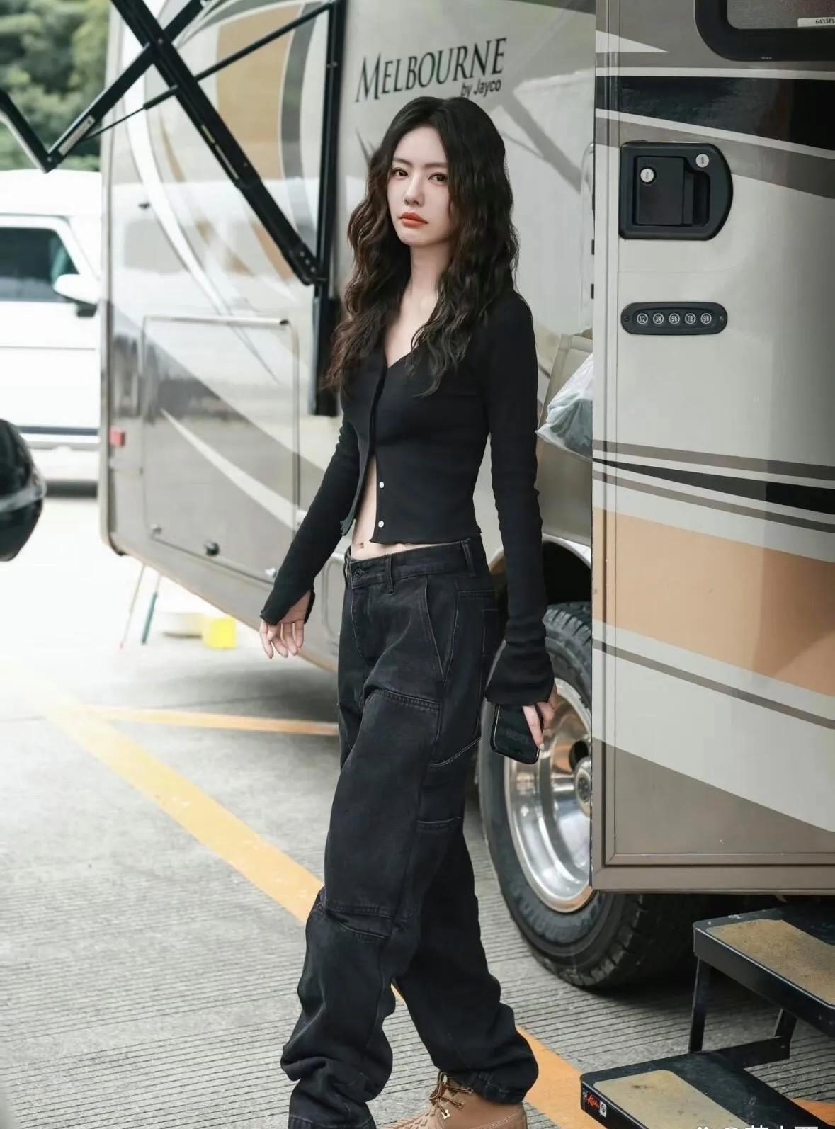 蔡文静这套穿搭,打工人直接照搬! 黑色针织开衫+工装牛仔裤,休闲又干练, 露腰设
