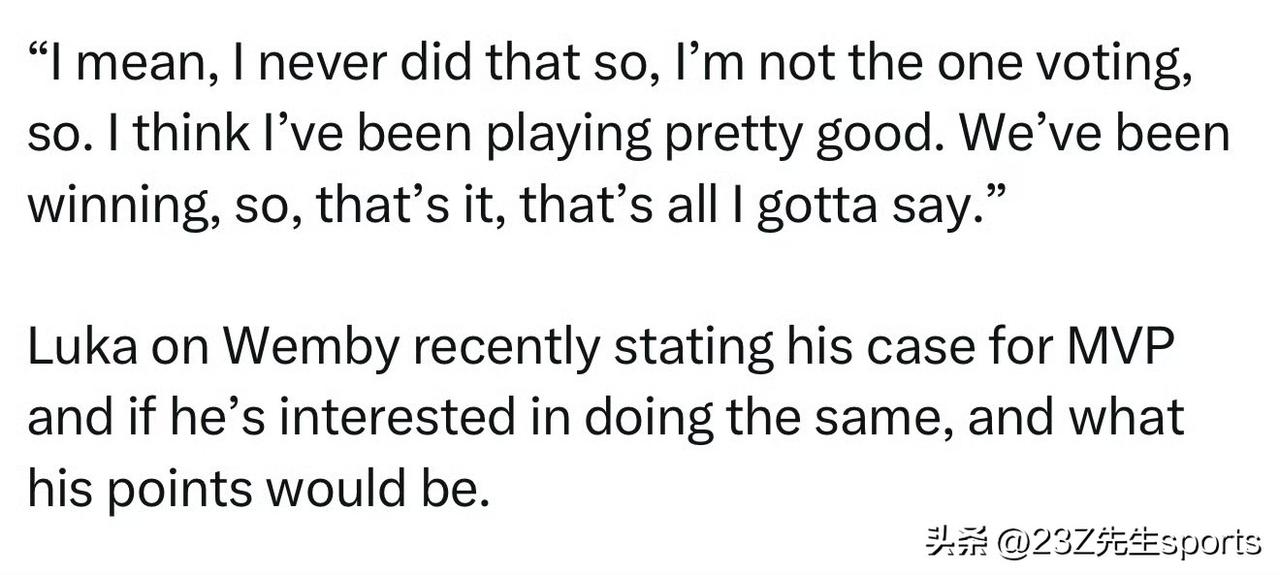 东契奇回应文班亚马近日自称应获MVP一事,被问及是否也会为自己拉票: “我从来