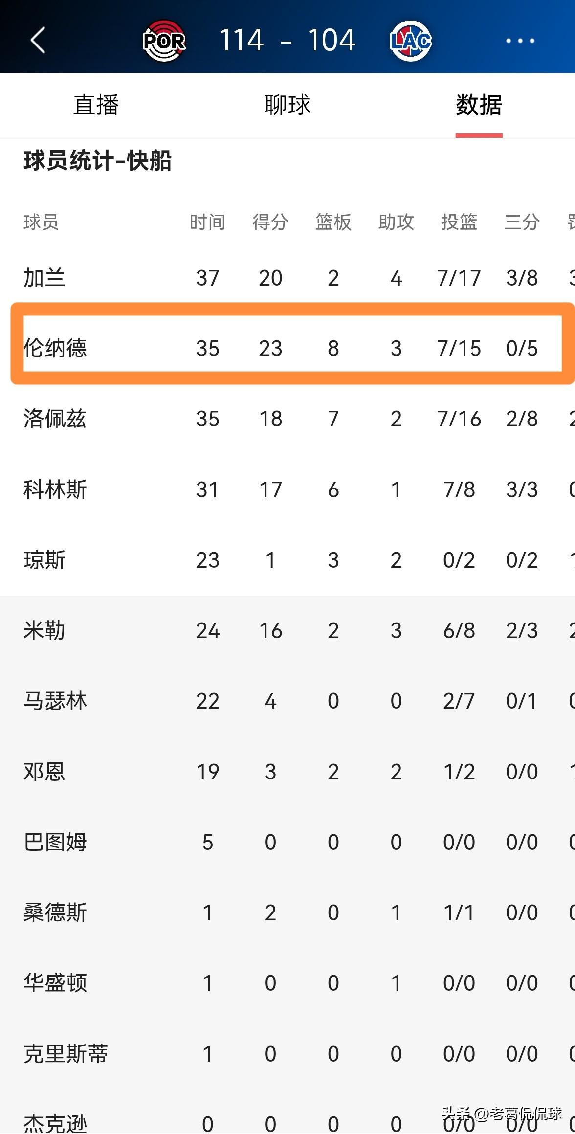 快船巨星伦纳德在三分线外的表现真是惨不忍睹!在今天快船主场以104:114输给开拓者的比赛中,伦纳德的三分手感异常冰凉,他在三分线外出手5次却颗粒无收。 全场比赛下来,伦纳德首发出战35分钟,投篮15中7,其中三分球5中0、罚球10中9得到23分8篮板3助攻,还有3次失误,他的场上正负值为-6。 毫不客气的说,对于伦纳德这种级别的超级球星来说,三分球5中0的表现完全是无法接受的。