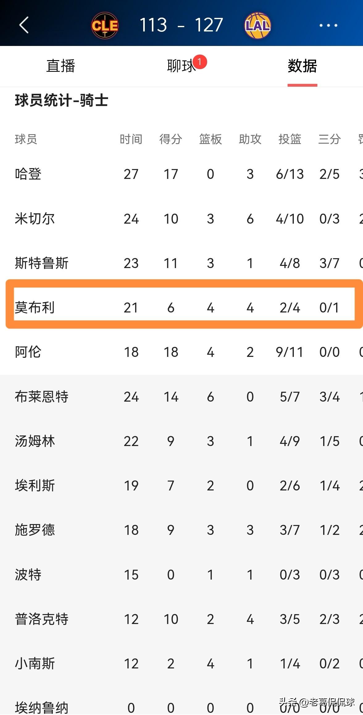 骑士球星莫布里真是太黯淡无光了!在今天骑士客场以113:127输给湖人的比赛中,莫布里在攻防两端都没有打出应有的表现,整个人看起来非常的黯淡无光。 全场比赛下来,莫布里首发出战21分钟,投篮4中2,其中三分球1中0、罚球2中2仅仅得到6分4篮板4助攻,他的场上正负值为-18。 老实说,本场比赛莫布里最大的问题是他在进攻端毫无欲望,我在莫布里的身上完全没有发现任何的赢球欲望。