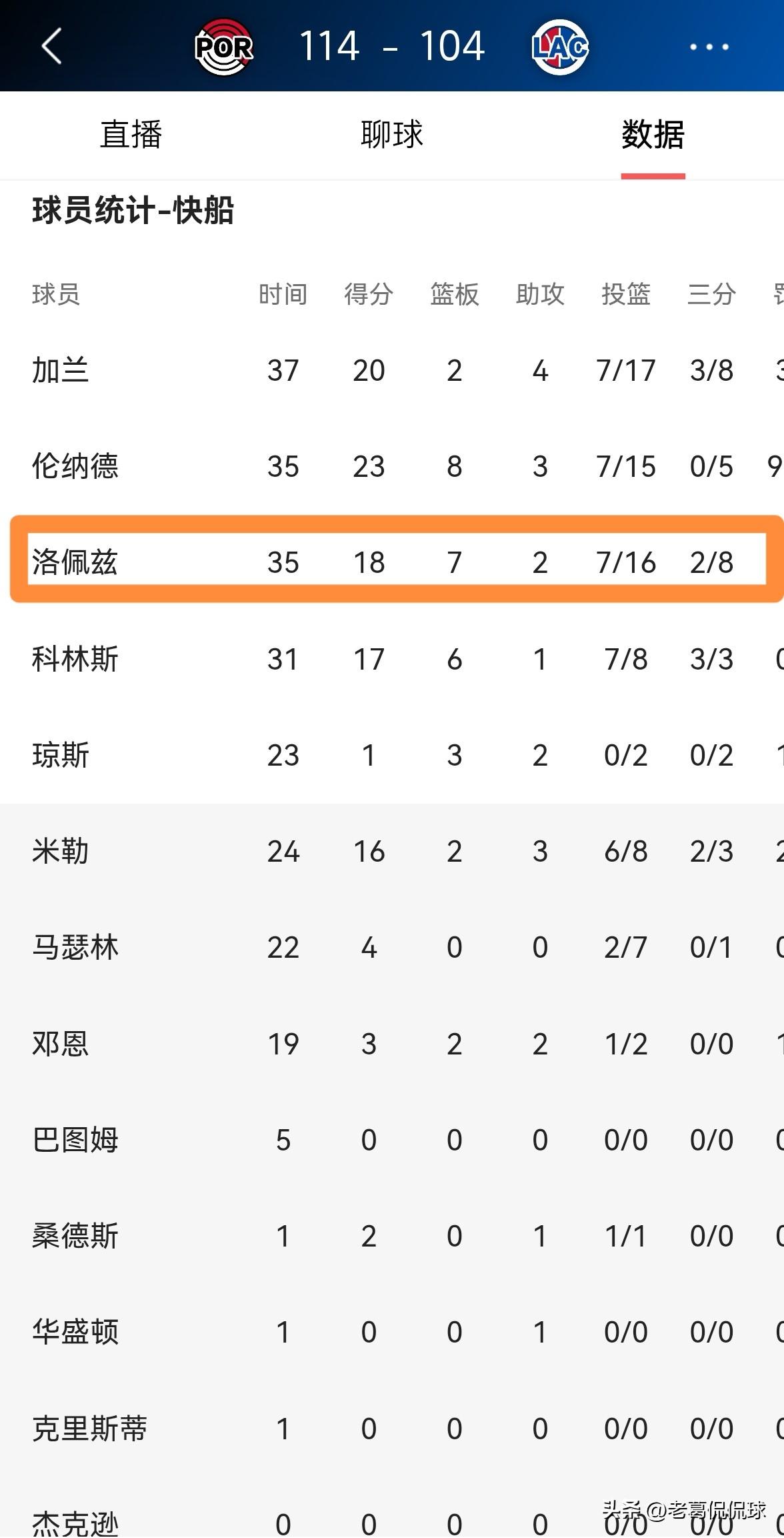快船老将洛佩兹真是太浪投三分了!在今天快船主场以104:114不敌开拓者的比赛中,洛佩兹在三分手感一般的情况下竟然浪投了8次,严重的影响了球队的整体进攻。 全场比赛下来,洛佩兹首发出战35分钟,投篮16中7,其中三分球8中2、罚球2中2得到18分,他的场上正负值为-11。 老实说,作为一名中锋,洛佩兹在一场比赛中出手8次三分球本来就不正常,何况他的三分手感又不好,洛佩兹应该增强自己的篮下进攻才对。