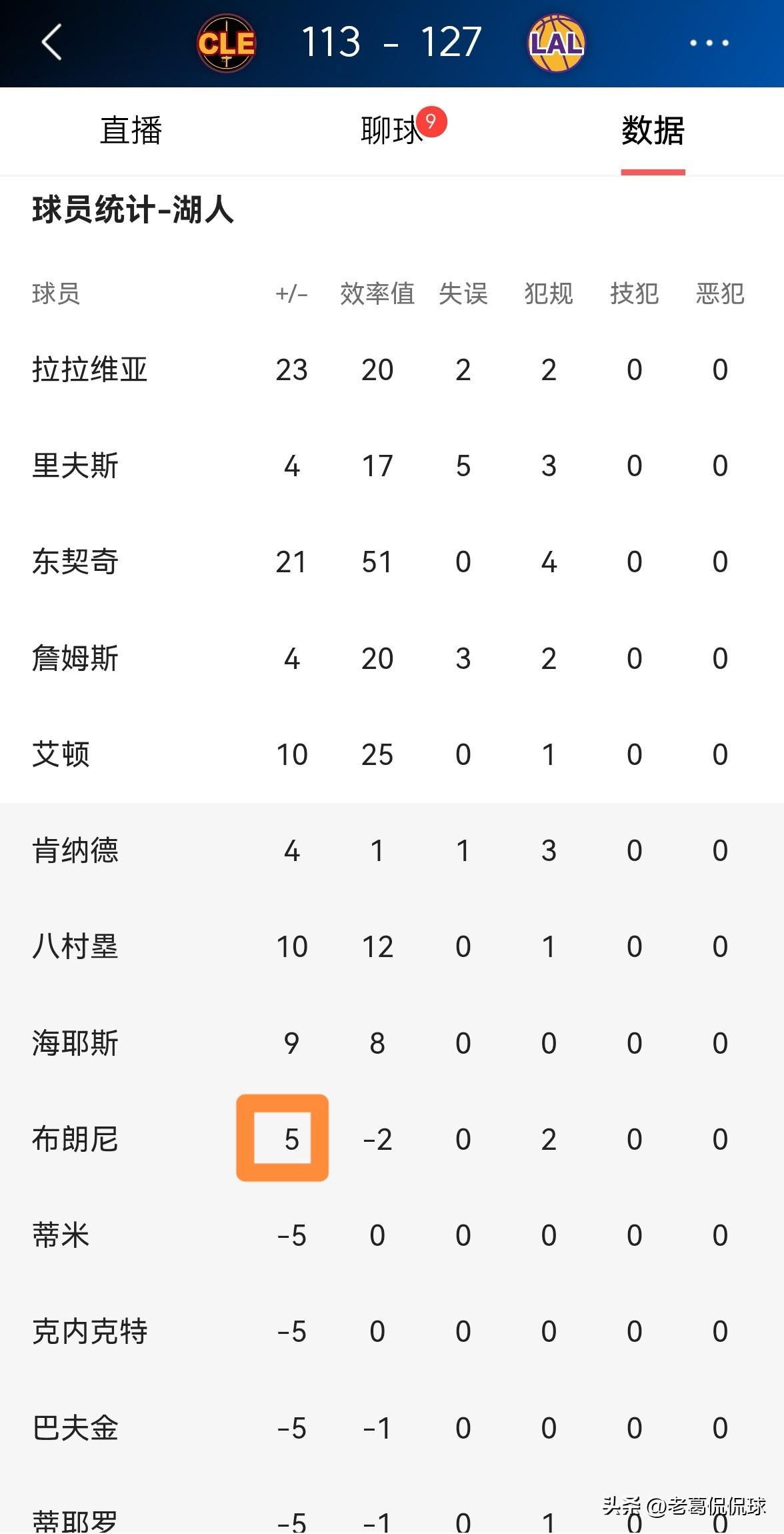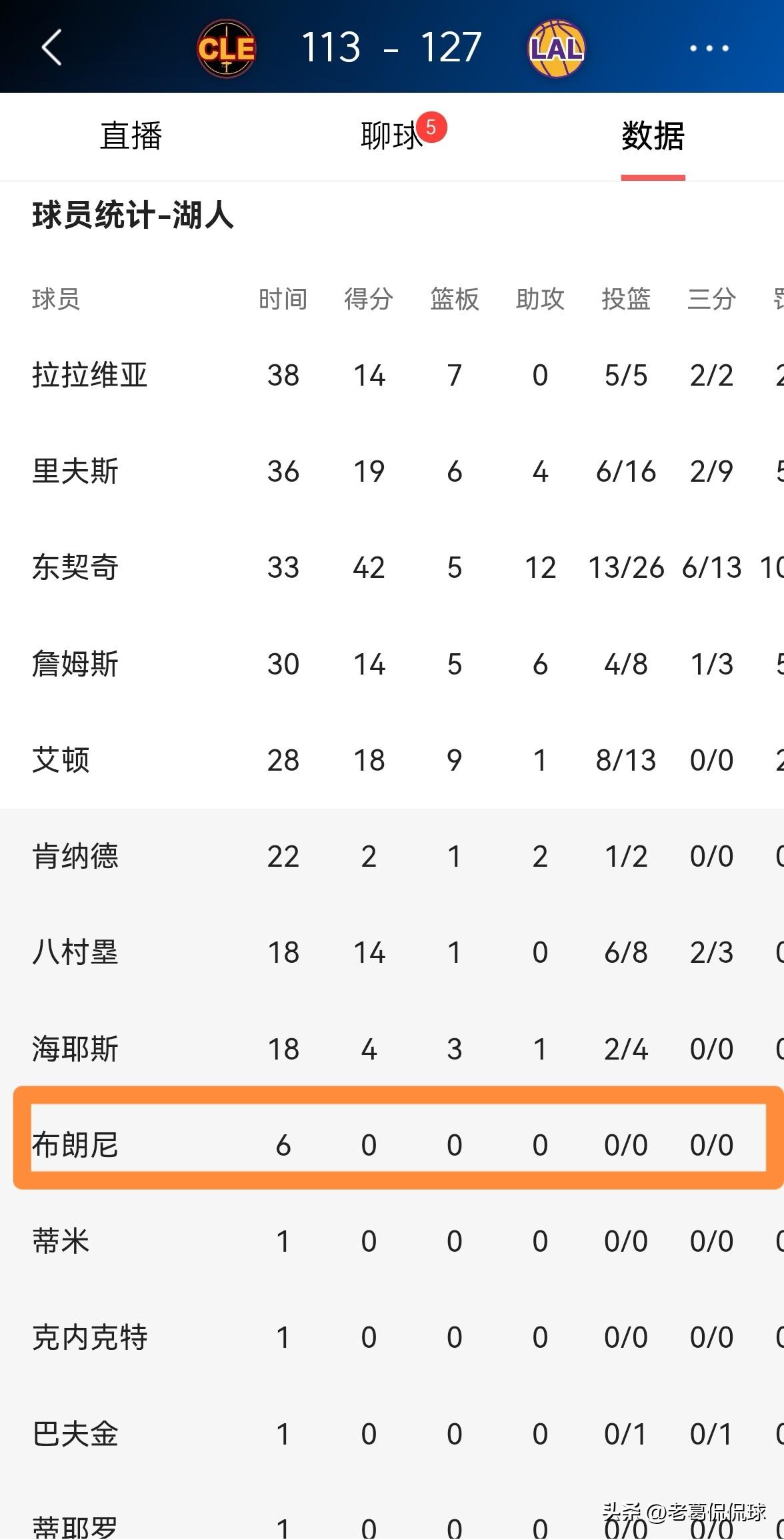 湖人新星布朗尼真是太幸运了!在今天湖人主场以127:113击败骑士的比赛中,虽然布朗尼在场上毫无存在感,但是他却非常幸运的得到了+5的场上正负值。 整场比赛下来,布朗尼替补出战6分钟,没有出手怒砍0分0篮板0助攻0抢断0盖帽,不过有2次犯规,他的场上正负值为+5。 说实话,布朗尼绝对是当今联盟最幸运的球员之一,他仗着自己的父亲是詹姆斯,因此他最近一段时期顺利的进入到了湖人的常规轮换阵容里。