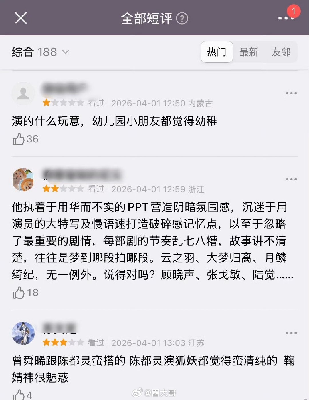 月鳞绮纪疑似被恶意打分 郭敬明新剧《月鳞绮纪》开播后,观众的首播评价来了,被吐槽剧情和滤镜让人看着出戏,还有观众想看陈都灵和鞠婧祎谈恋爱的,田嘉瑞的妆造居然有粉底液将军内味了,不过新剧刚开播,可以再蹲蹲啦~月鳞绮纪首播评价
