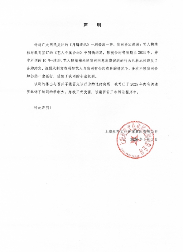 今日一早,丝芭传媒再度发文和公告,称已经起诉《月鳞绮纪》的承制方,鞠婧祎与我司签订的《艺人专属合约》中明确约定,影视合约有限期至2033年,并非所谓的10年+续约。艺人鞠婧祎未经我司同意出演该剧的行为已根本性违反了合约约定,该剧承制方在明知艺人与我司有合约在身的情况下,多次不顾我司告知仍然一意孤行,侵犯了我司的合法权利。