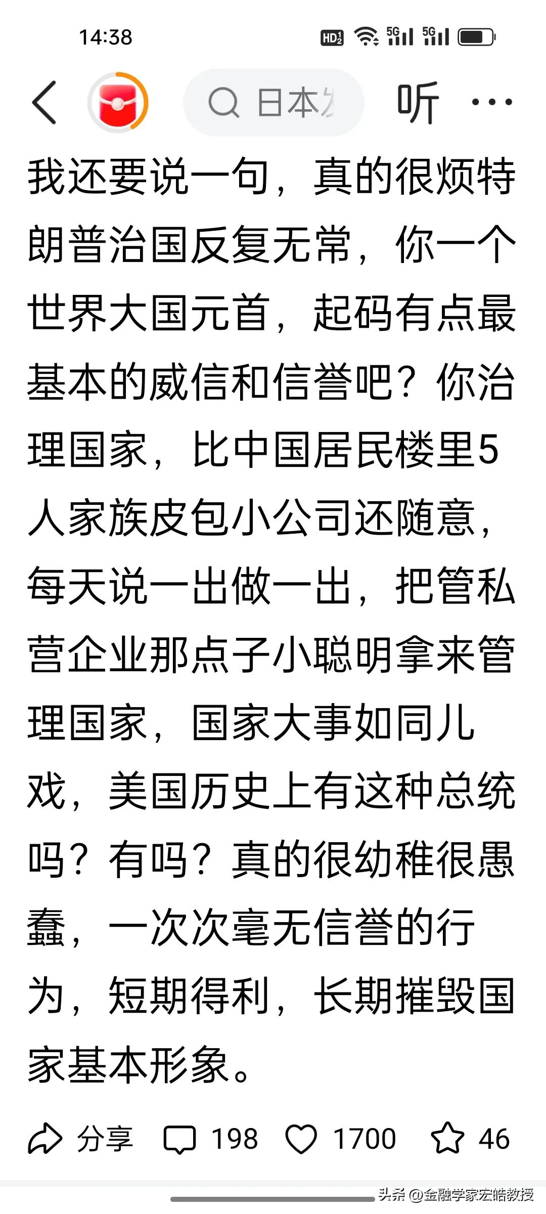 “治大国若烹小鲜”本指治国需审慎稳重,特朗普却反其道而行,把国家大事当投机筹码,朝令夕改、说一弃一。网友也直言他把总统当“合同工”,主业搞家族企业、割资本韭菜,副业管国家。