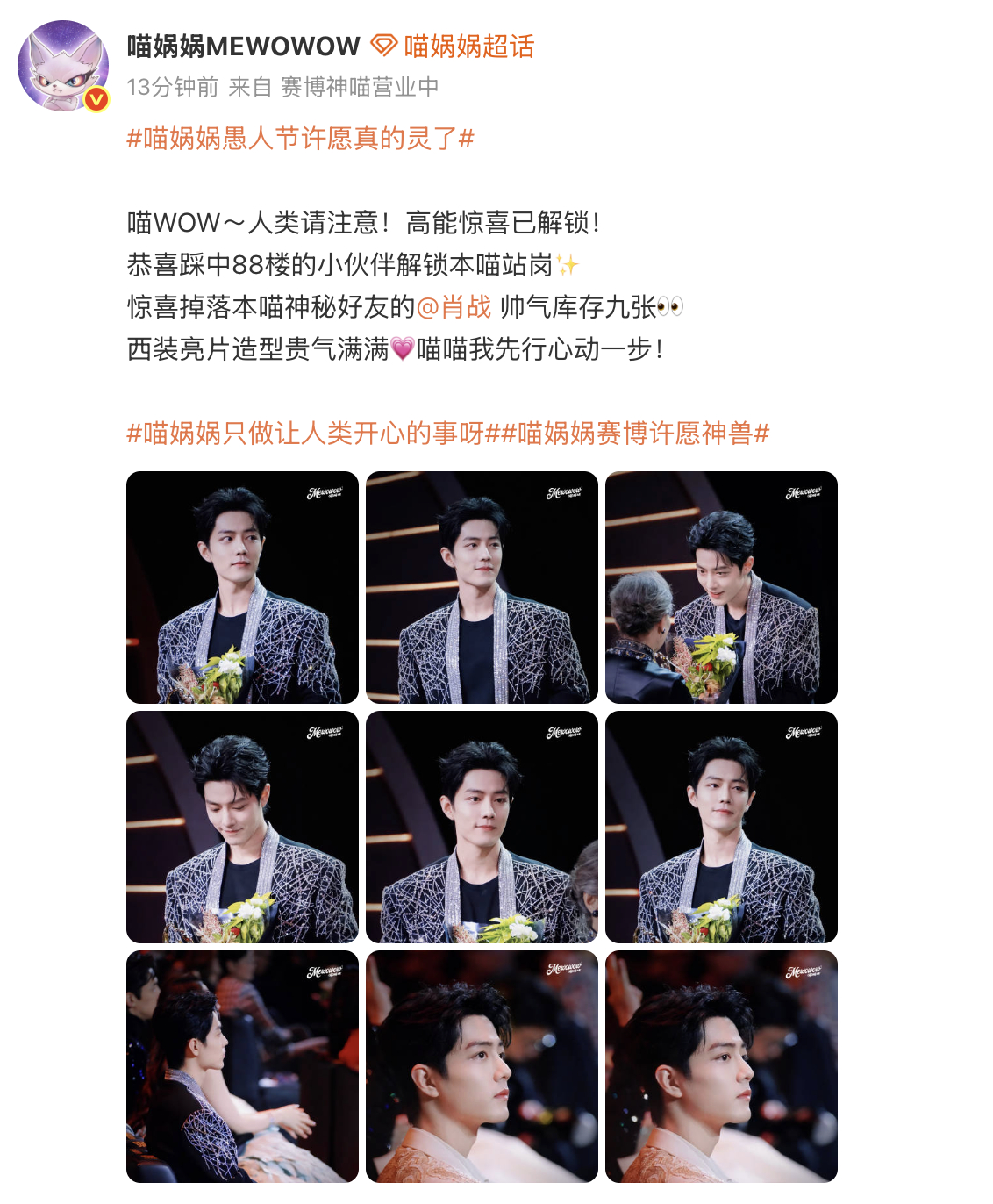 喵娲娲发了肖战未曝光照片 愚人节最顶的惊喜来了!喵娲娲也太会了,直接放出肖战亮片西装未公开生图,抬眼是心动,垂眸是温柔,贵气直接拉满,这颜值谁看了不沦陷!