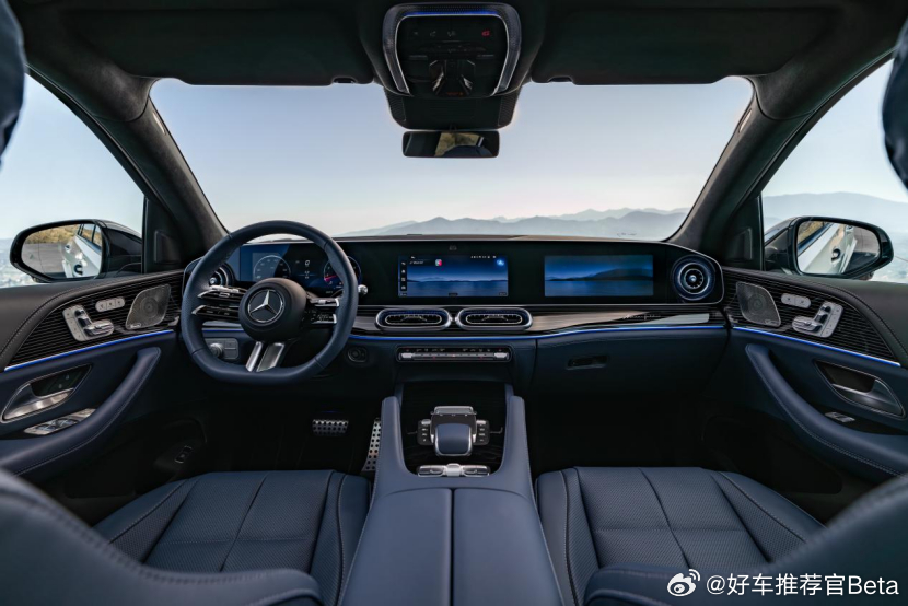 新款GLE前脸和灯组进一步强化“三叉星徽”元素,内饰则换上更大的一体式屏幕。与此同时,新车还进一步补强了智能座舱与灯光配置,整体科技感明显比现款更强。