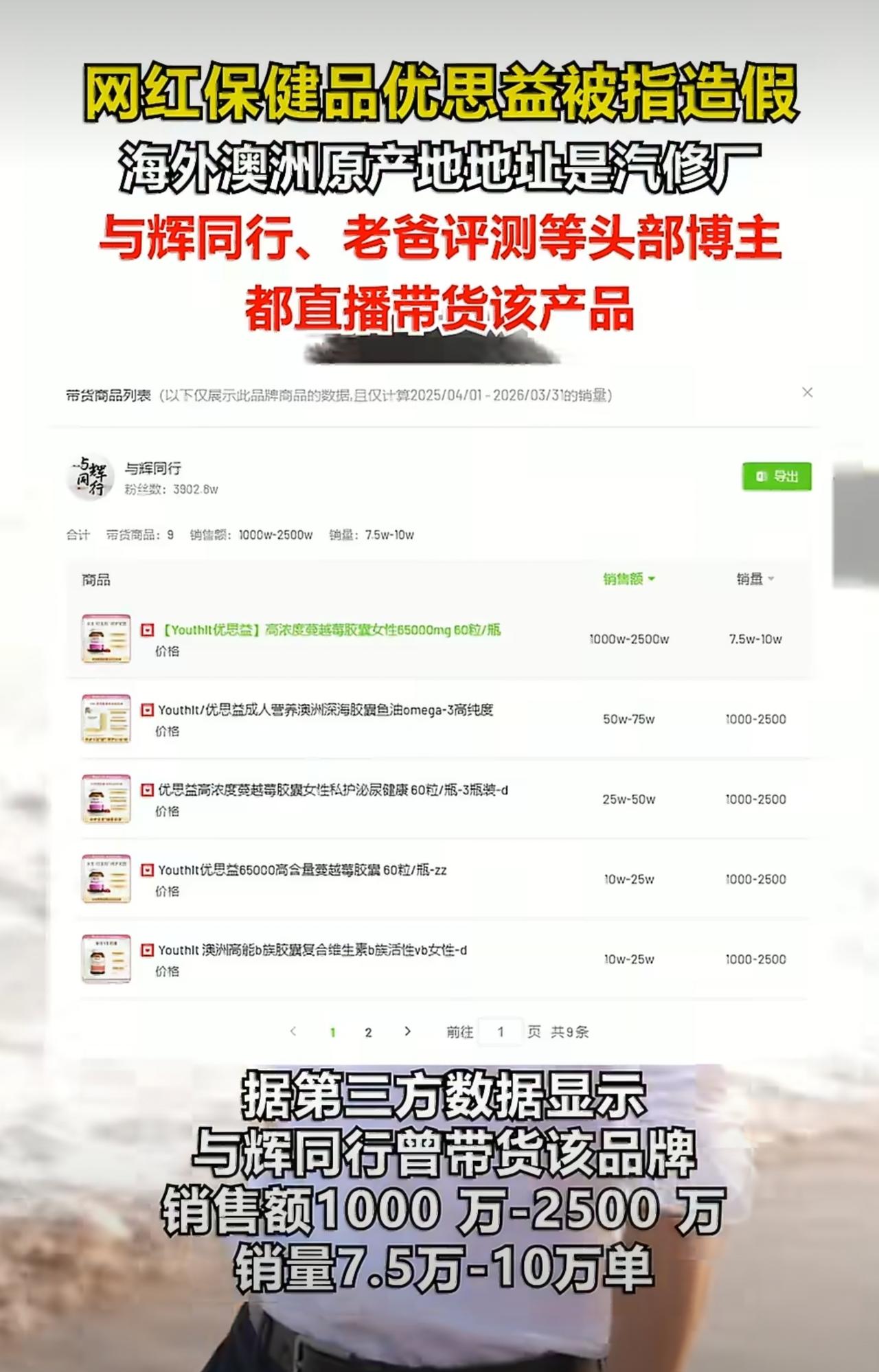 优思益这波翻车连累董宇辉和与辉同行 号称澳洲原装进口的网红保健品,结果被扒出来所谓的海外原产地地址,居然是个汽修厂? 这不纯纯把消费者当冤大头耍吗? 吃进嘴里的东西都敢这么造假,是真的没把消费者的健康当回事啊! 更让人寒心到骨子里的是,这款产品董宇辉的与辉同行、老爸评测这些大家掏心窝子信任的头部博主都带过货!第三方数据摆在这里,与辉同行光这款产品就卖了1000万到2500万,足足7.5万到10万单! 多少人是冲着主播的口碑、冲着他们拍胸脯说的“严选标准”才掏的钱? 结果你们连产品的原产地真假都没查明白?别再拿粉丝的信任当摇钱树了! 必须给所有消费者一个彻彻底底的说法!
