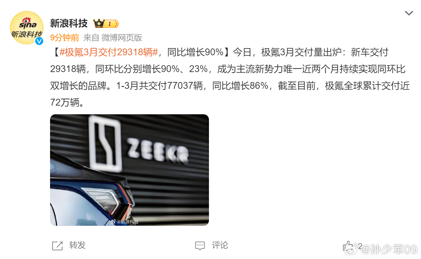 极氪3月交付量出炉:新车交付29318辆,同环比分别增长90%、23%