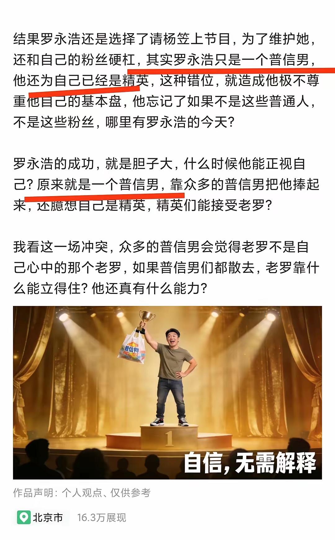 老罗被项立刚一句“普信男代表”直接扎心了! 要知道,罗永浩自己可从不认这标签。他总说自己是“理想主义的失败者”,清醒又自嘲,跟那些盲目自信、看不起别人的“普信男”八竿子打不着。 但项立刚太会了,专挑老罗的逆鳞摸,把他归成普信男代表,这波操作直接拉满仇恨值啊!更微妙的是,舆论场上其实一直有种矛盾态度:把他混同普信男,又把他与普信男隔离,高!实在是高! 说到底,老罗最大的黑历史,就是当年得意忘形,开始粉日粉美,丑化国人。历史是有记忆的,为什么不敢怼项立刚?这块是硬伤,再厉害的口才也圆不回去。