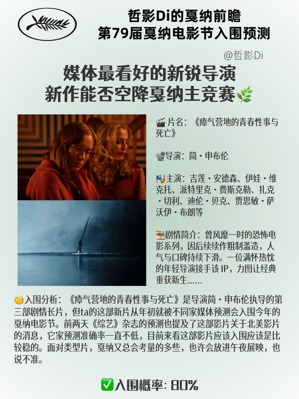 🧐入围分析:《瘴气营地的青春性事与死亡》是导演简·申布伦执导的第三部剧情长片,但ta的这部新片从年初就被不同家媒体预测会入围今年的戛纳电影节。前两天《综艺》杂志的预测也提及了这部影片关于北美影片的消息,它家预测准确率一直不低,目前来看这部影片应该入围应该是比较稳的。面对类型片,戛纳又总会考量的多些,也许会放进午夜展映,也说不准。✅入围概率:80%