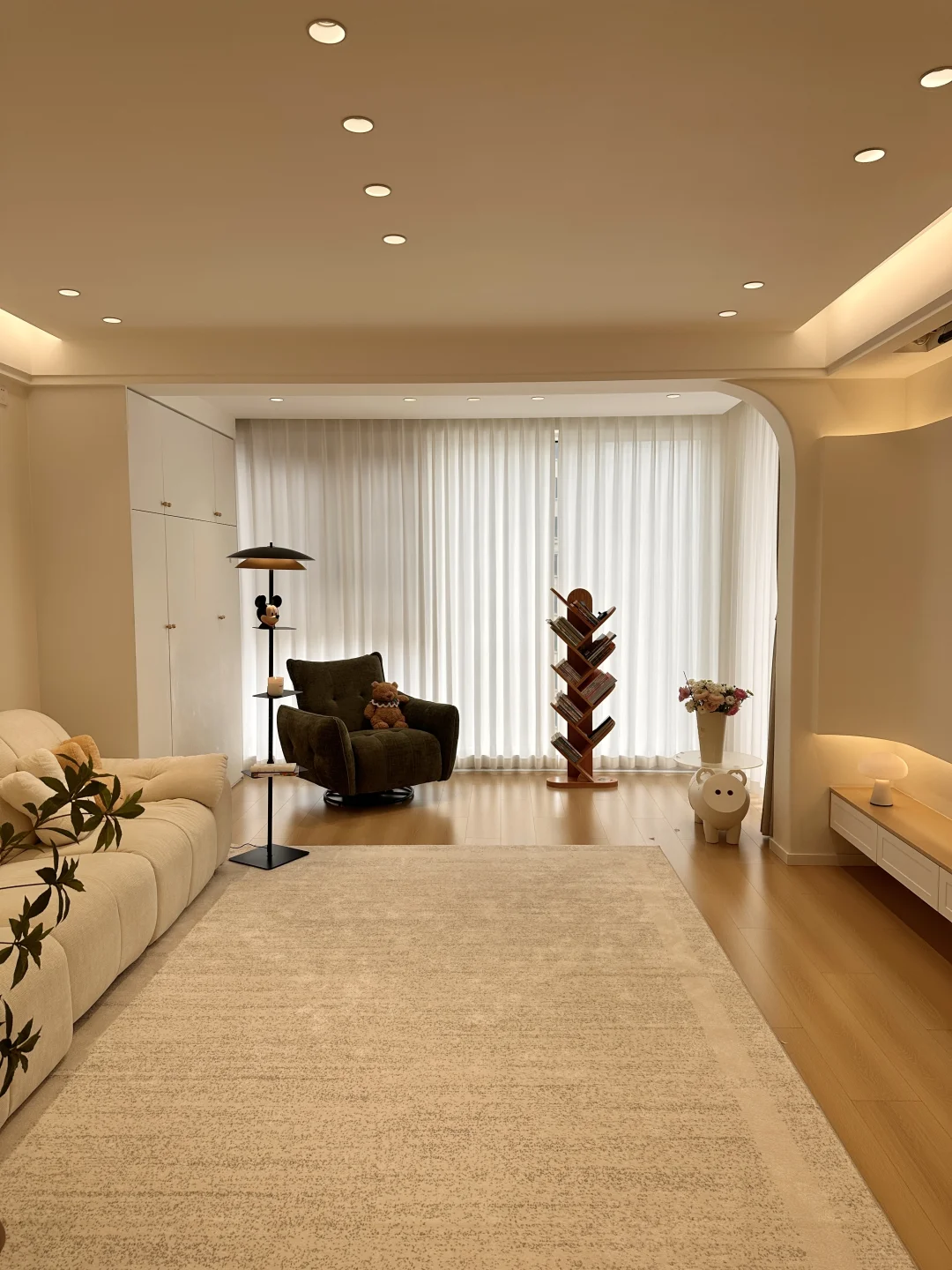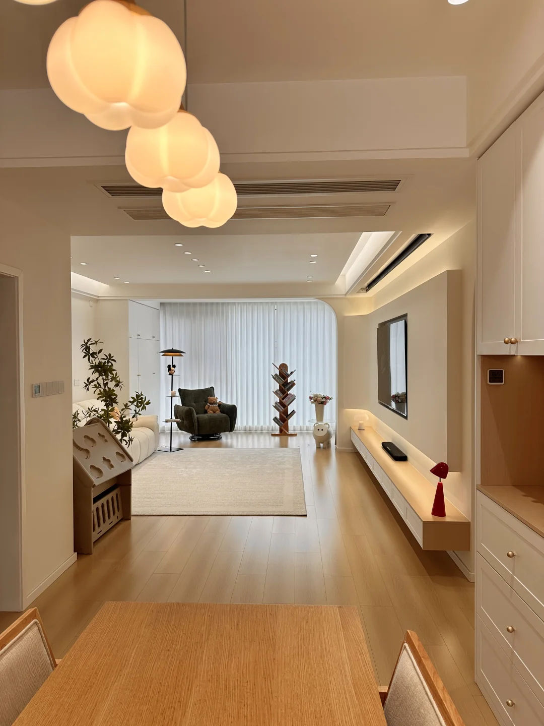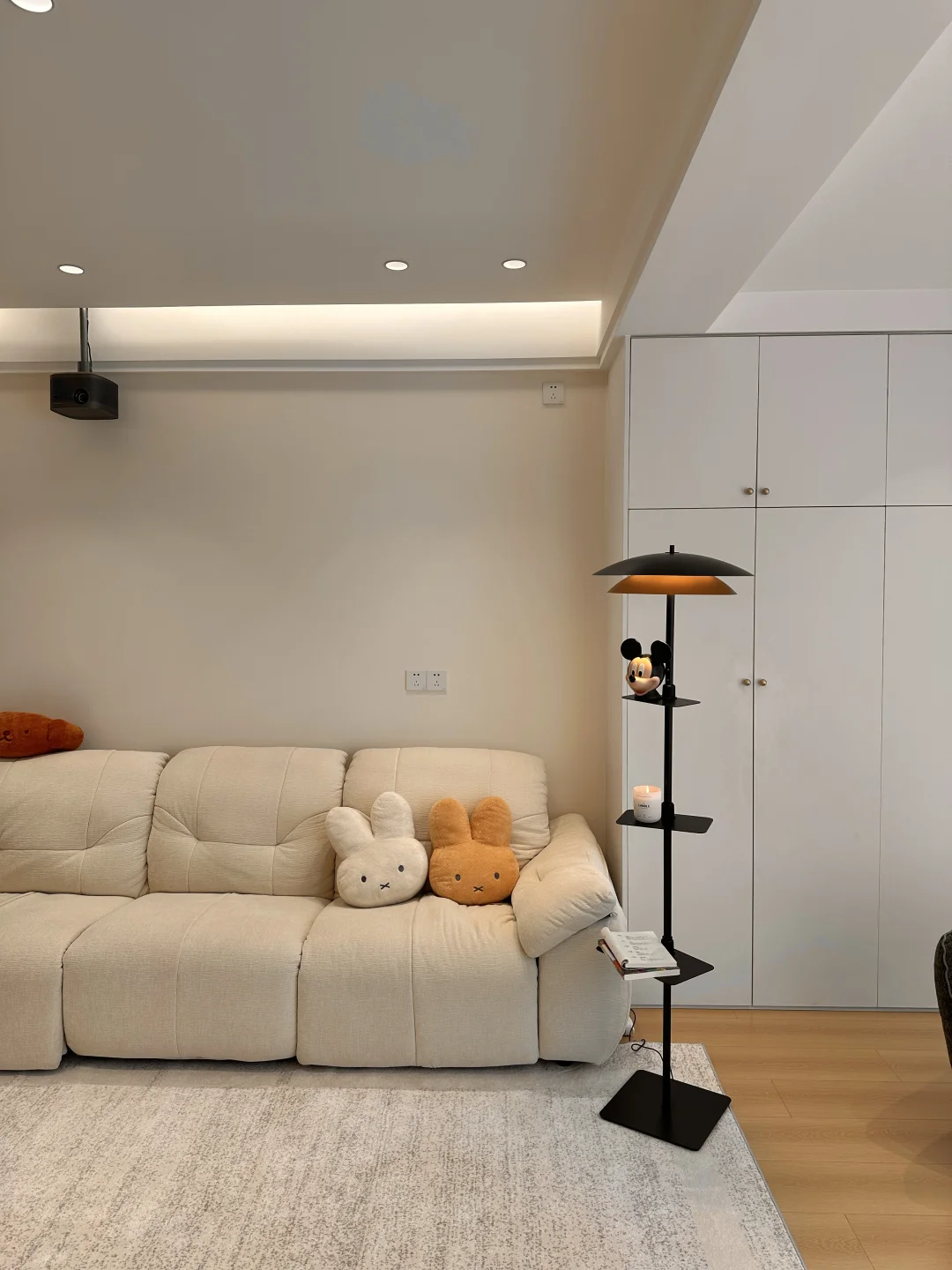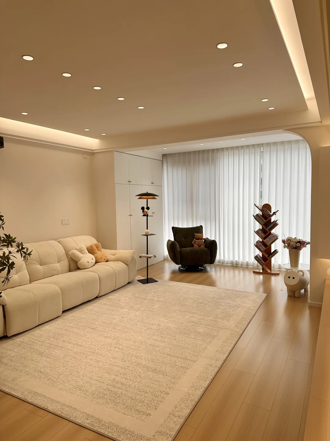 我的小家套内108,硬装花了15W,虽然是穷装,但还挺好看,宽敞的客厅,奶呼呼的沙发,一块舒服的地毯,挪菲落地灯散发着温柔的光,整个客厅都暖了起来,自带三层置物架,放在卧室也是很适配的,氛围感直接拉满~