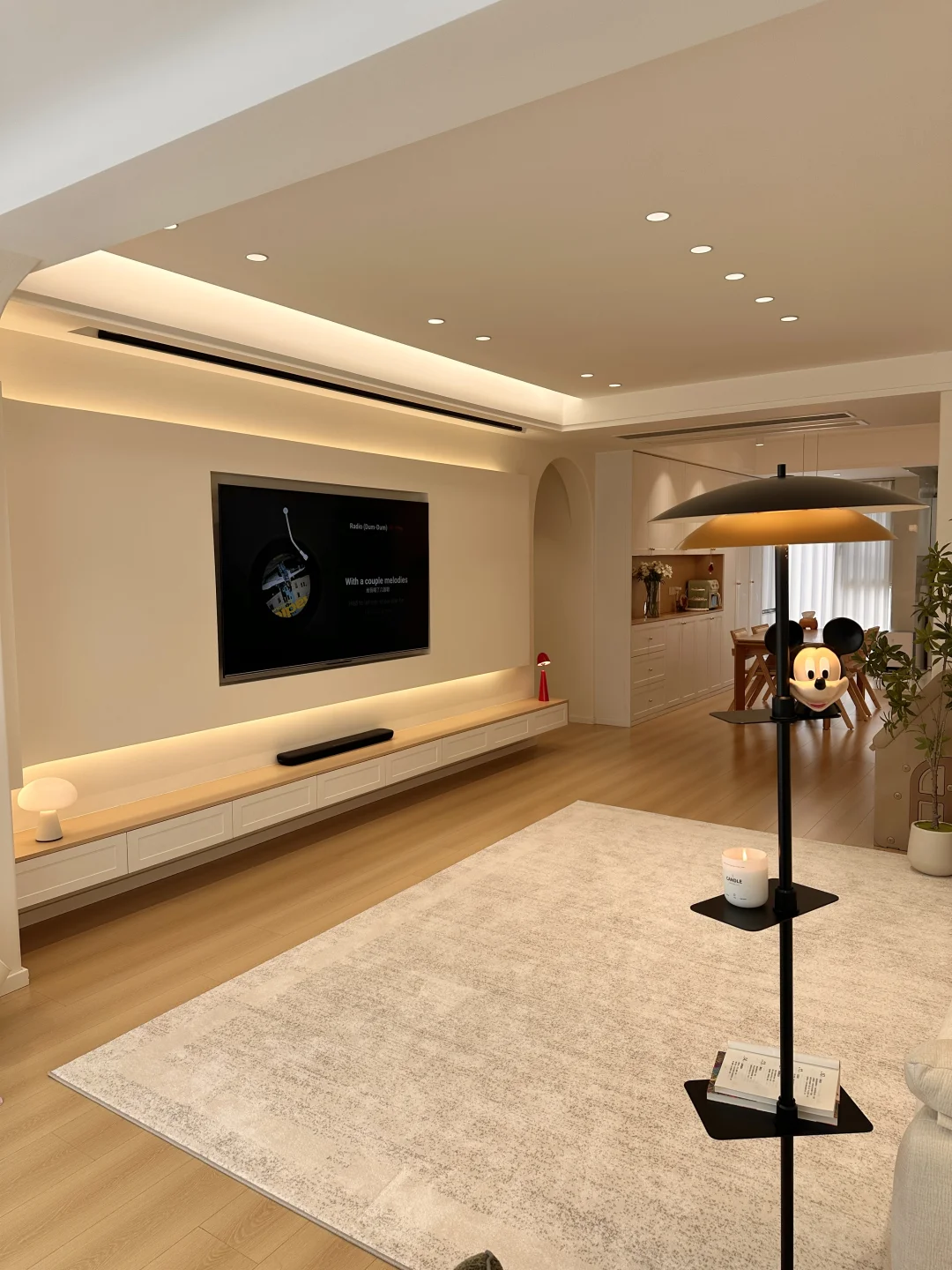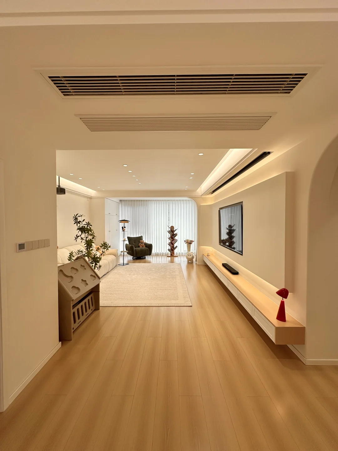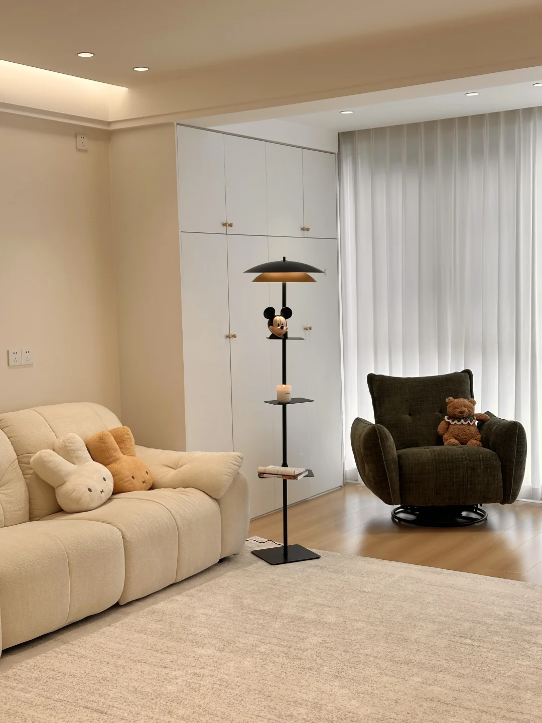 我的小家套内108,硬装花了15W,虽然是穷装,但还挺好看,宽敞的客厅,奶呼呼的沙发,一块舒服的地毯,挪菲落地灯散发着温柔的光,整个客厅都暖了起来,自带三层置物架,放在卧室也是很适配的,氛围感直接拉满~