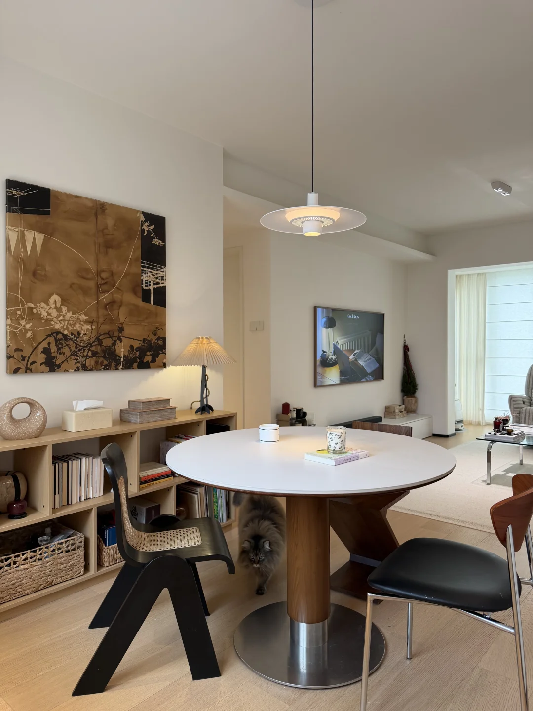 我家套内 80 平,餐厅 8.5m² 餐厅靠窗部分做了水吧台餐边柜 餐厅:303cm*281cm 餐桌: 110cm * 75cm 吊灯: 50cm 距离桌面80cm 餐边柜: 274cm * 90cm * 45cm
