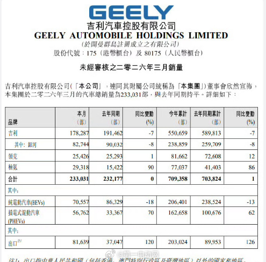 吉利 3 月销量 233031 辆,与去年同期持平;极氪 3 月新车交付 293