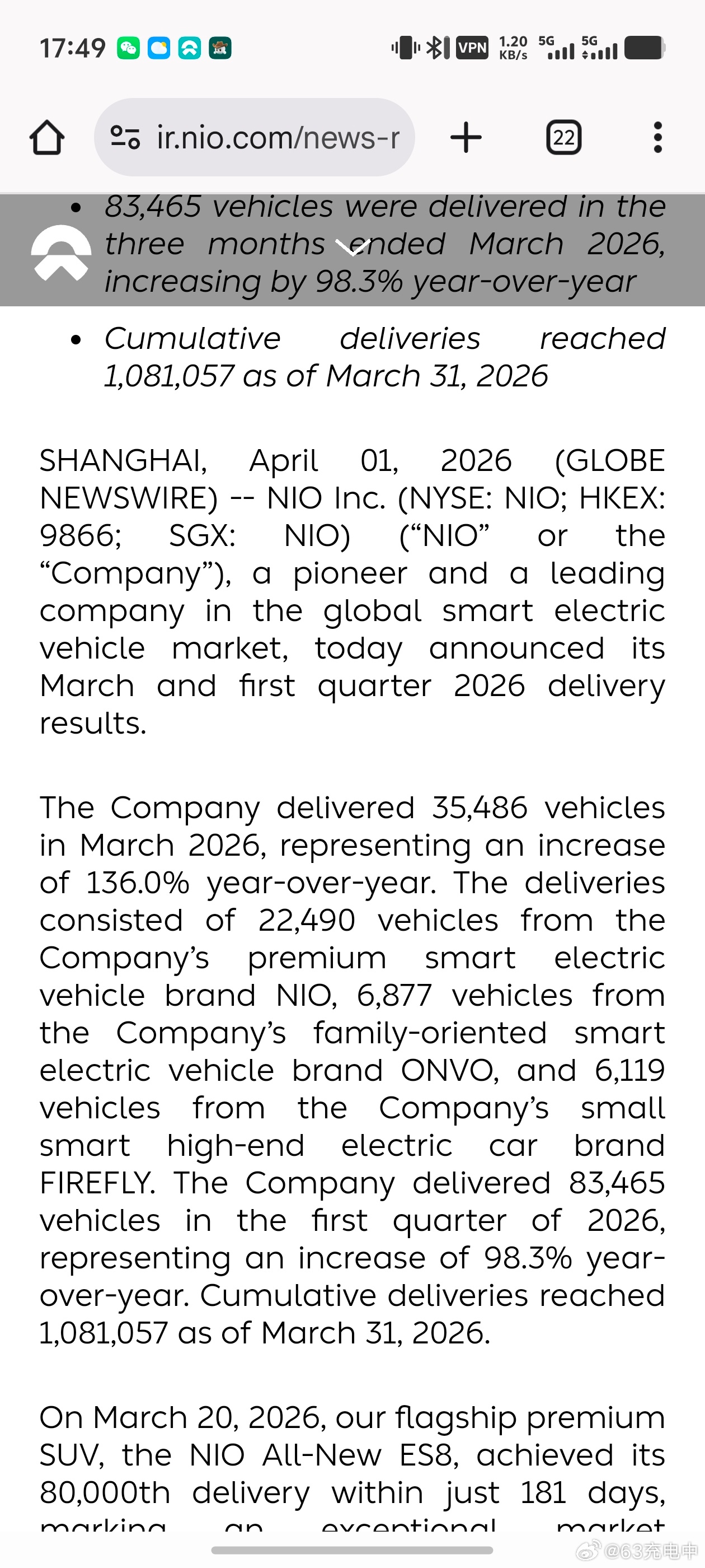 蔚来 3 月交付量 35,486 辆,其中:- 蔚来 22,490 辆- 乐道