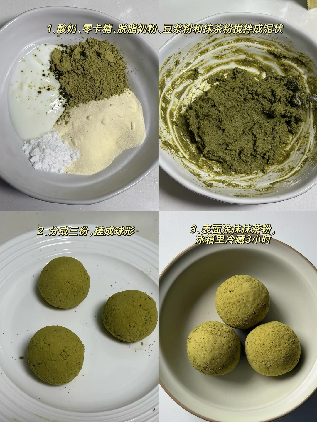酸奶抹茶球,本来想只用无糖豆浆粉的,但为了提香和增强口感,还加了脱脂奶粉,最后味道真的超级棒!原料太干净了,一口一个毫无负担~
