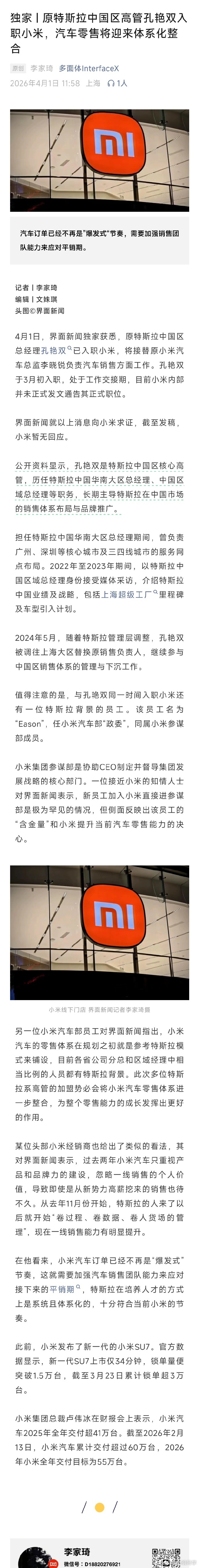 原特斯拉中国区高管入职小米 恭喜小米汽车又添一员猛将啊,今年新能源市场还是残酷洗
