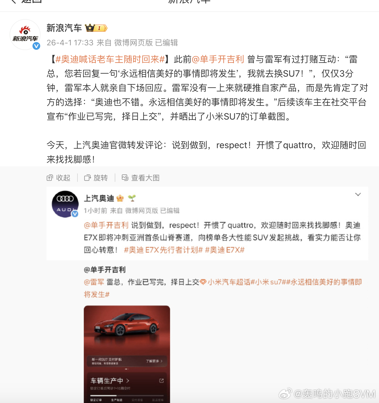 单手开吉利买了小米的车被雷总肯定奥迪不错,这到底是谁家的广告????